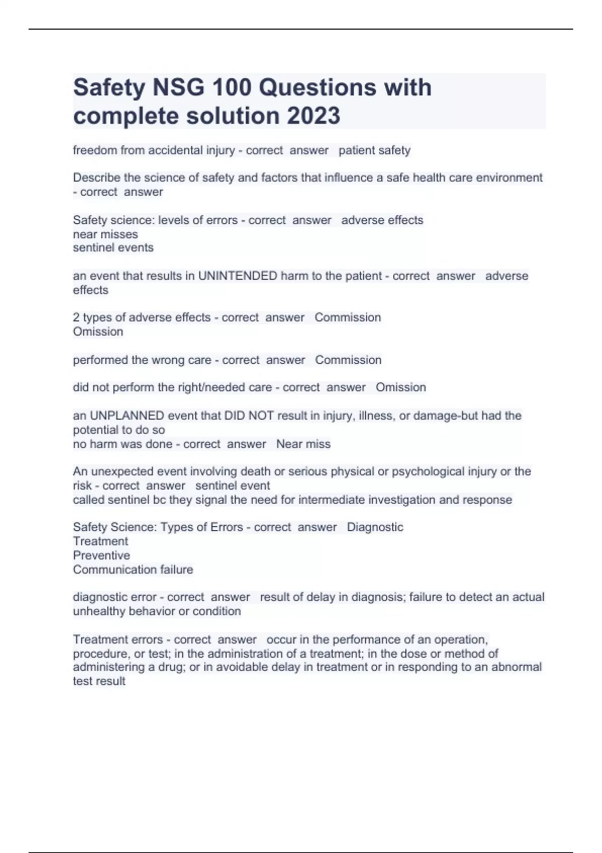 Safety NSG 100 Questions with complete solution 2023 freedom from accidental injury - correct answer patient safety Describe the science of safety and factors that influence a safe health care environment - correct answer Safety science: levels of errors - correct answer adverse effects near misses sentinel events an event that results in UNINTENDED harm to the patient - correct answer adverse effects 2 types of adverse effects - correct answer Commission Omission performed the wrong care - correct answer Commission did not perform the right/needed care - correct answer Omission an UNPLANNED event that DID NOT result in injury, illness, or damage-but had the potential to do so no harm was done - correct answer Near miss An unexpected event involving death or serious physical or psychological injury or the risk - correct answer sentinel event called sentinel bc they signal the need for intermediate investigation and response Safety Science: Types of Errors - correct answer Diagnostic Treatment Preventive Communication failure diagnostic error - correct answer result of delay in diagnosis; failure to detect an actual unhealthy behavior or condition Treatment errors - correct answer occur in the performance of an operation, procedure, or test; in the administration of a treatment; in the dose or method of administering a drug; or in avoidable delay in treatment or in responding to an abnormal test result