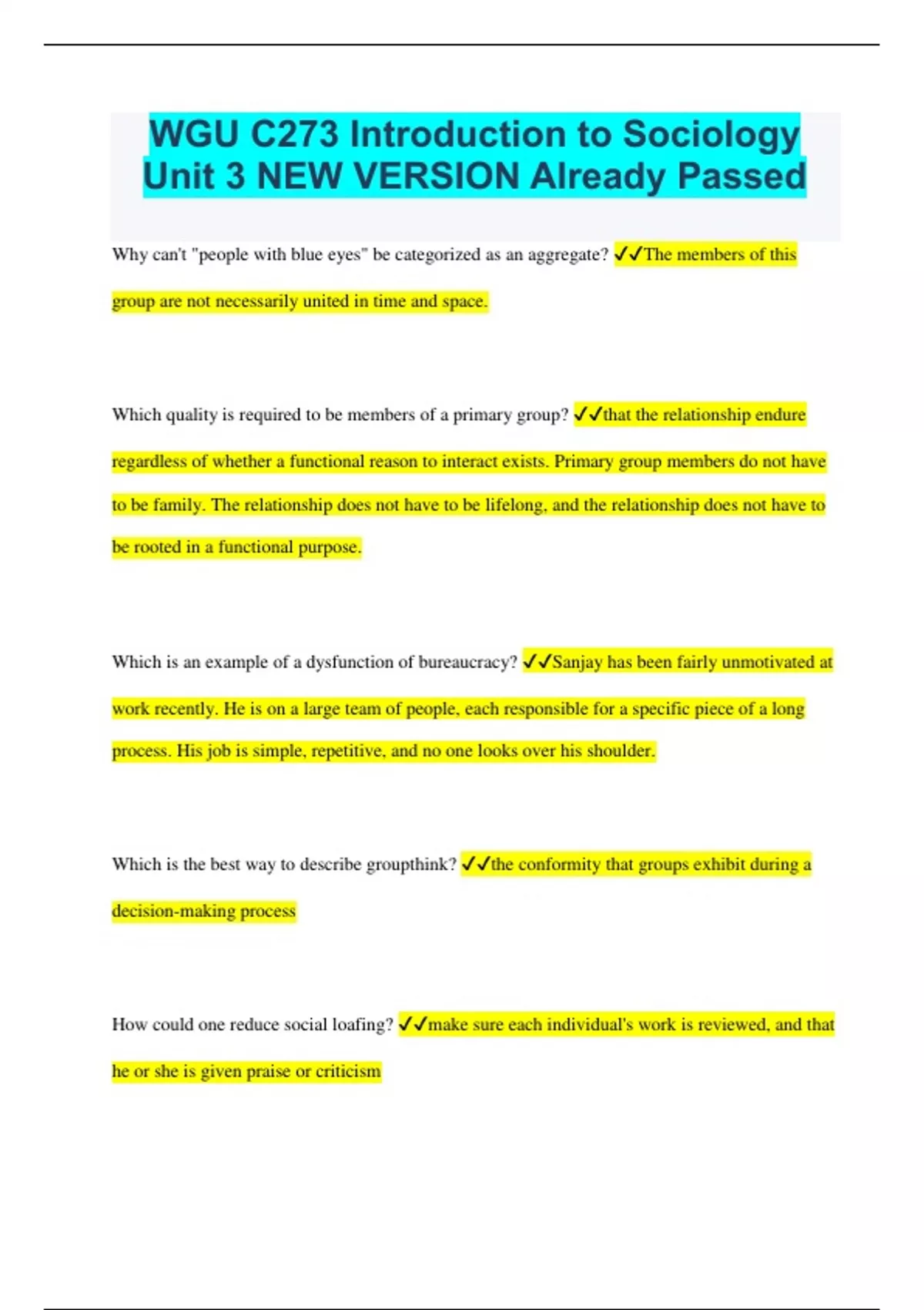 WGU C273 Introduction to Sociology Unit 3 NEW VERSION