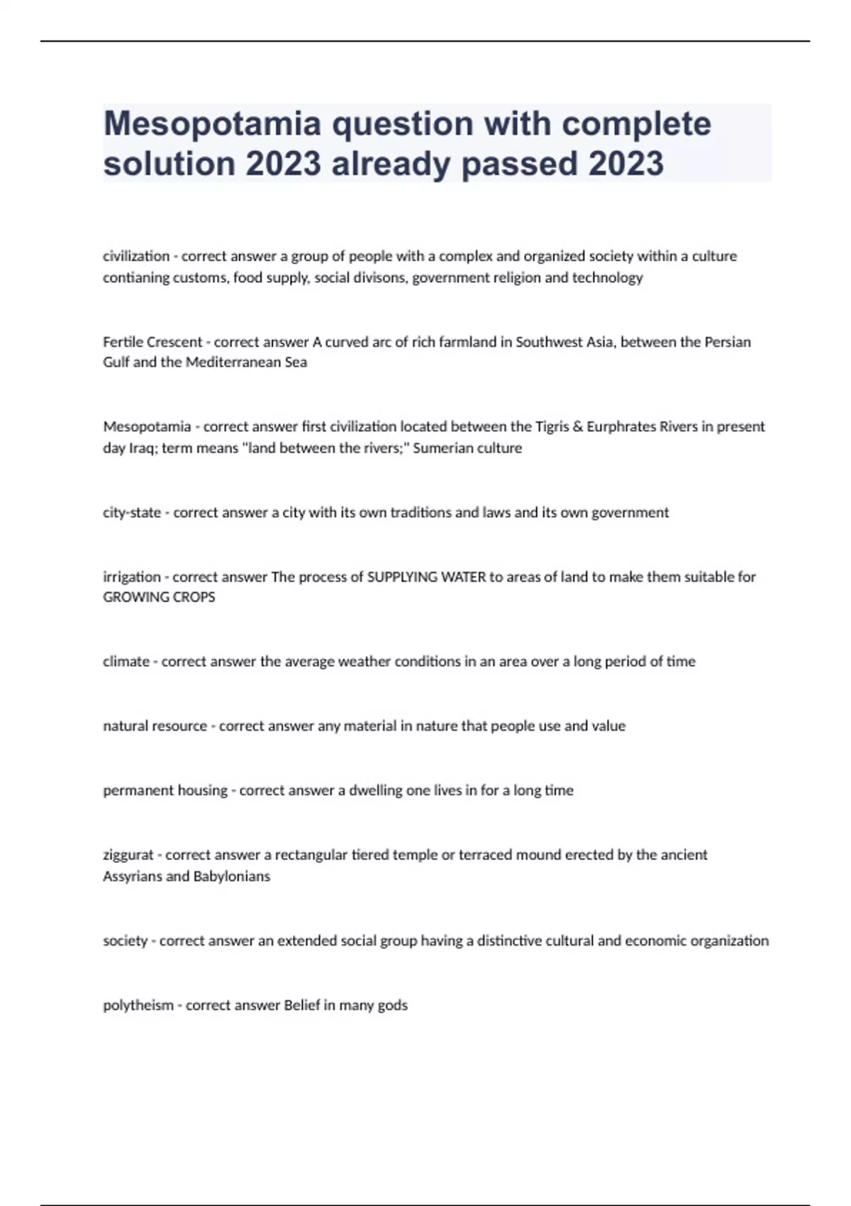 Mesopotamia question with complete solution 2023 already passed 2023civilization - correct answer a group of people with a complex and organized society within a culture contianing customs, food supply, social divisons, government religion and technology Fertile Crescent - correct answer A curved arc of rich farmland in Southwest Asia, between the Persian Gulf and the Mediterranean Sea Mesopotamia - correct answer first civilization located between the Tigris & Eurphrates Rivers in present day Iraq; term means "land between the rivers;" Sumerian culture city-state - correct answer a city with its own traditions and laws and its own government irrigation - correct answer The process of SUPPLYING WATER to areas of land to make them suitable for GROWING CROPS climate - correct answer the average weather conditions in an area over a long period of time natural resource - correct answer any material in nature that people use and value permanent housing - correct answer a dwelling one lives in for a long time ziggurat - correct answer a rectangular tiered temple or terraced mound erected by the ancient Assyrians and Babylonians society - correct answer an extended social group having a distinctive cultural and economic organization polytheism - correct answer Belief in many gods divine kingship - correct answer a form of monarchy where the king is considered to be godly and legitimate; he has absolute power and was chosen by a god or God to rule. class system - correct answer system in which society is divided into different social groups based on one's job or occupation scribe - correct answer a professional writer cuneiform - correct answer an ancient wedge-shaped script used in Mesopotamia and Persia dynasty - correct answer a powerful family or group of rulers that maintains its position or power for some time - to pass power form father to son.