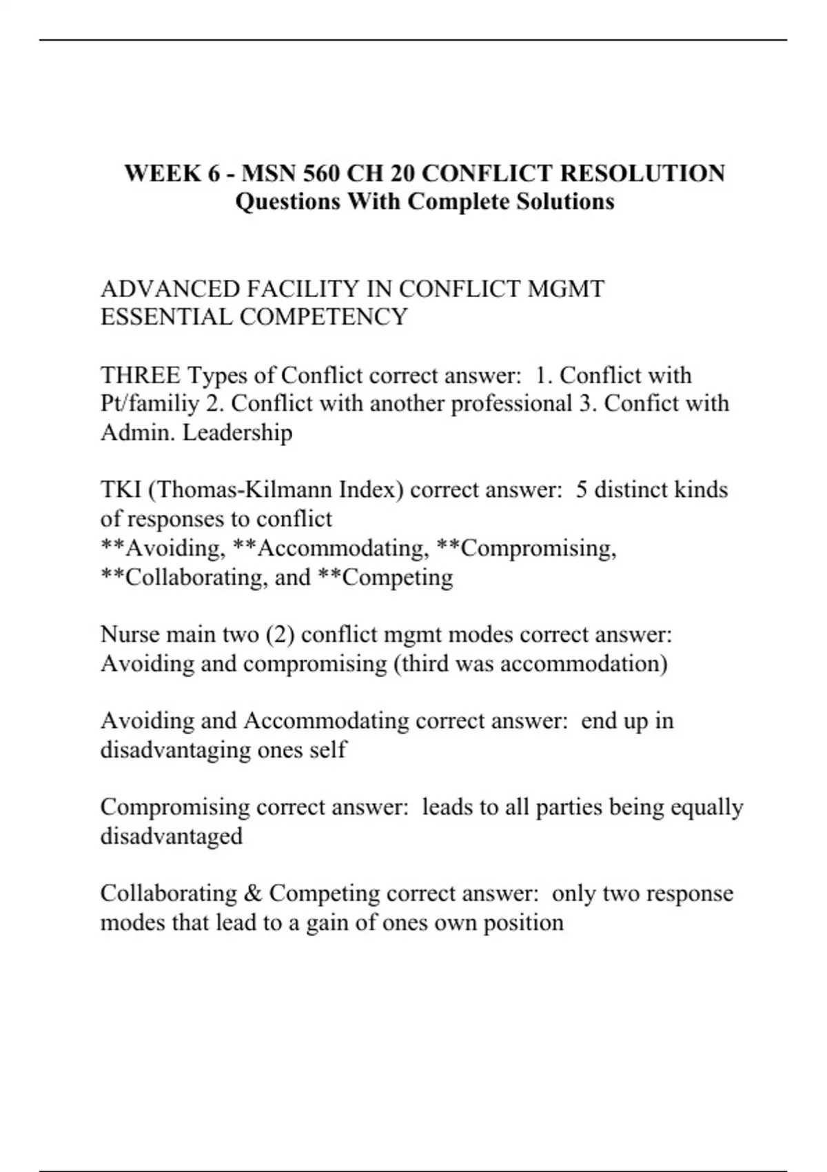 ADVANCED FACILITY IN CONFLICT MGMT ESSENTIAL COMPETENCY THREE Types of Conflict correct answer: 1. Conflict with Pt/familiy 2. Conflict with another professional 3. Confict with Admin. Leadership TKI (Thomas-Kilmann Index) correct answer: 5 distinct kinds of responses to conflict **Avoiding, **Accommodating, **Compromising, **Collaborating, and **Competing Nurse main two (2) conflict mgmt modes correct answer: Avoiding and compromising (third was accommodation) Avoiding and Accommodating correct answer: end up in disadvantaging ones self Compromising correct answer: leads to all parties being equally disadvantaged Collaborating & Competing correct answer: only two response modes that lead to a gain of ones own position Nurses observed to be most typically? (by Wharton) correct answer: Accommodating (Bad b/c can be squeezed between pts. and MDs Taback & Orit (Study approaches to conflict and resulting stress lvl" correct answer: 1. Integrate & Dominance = Collaborate & Compete-Low Stress 2.Obliging & Avoidance=Compromise/accom.; Higher stres
