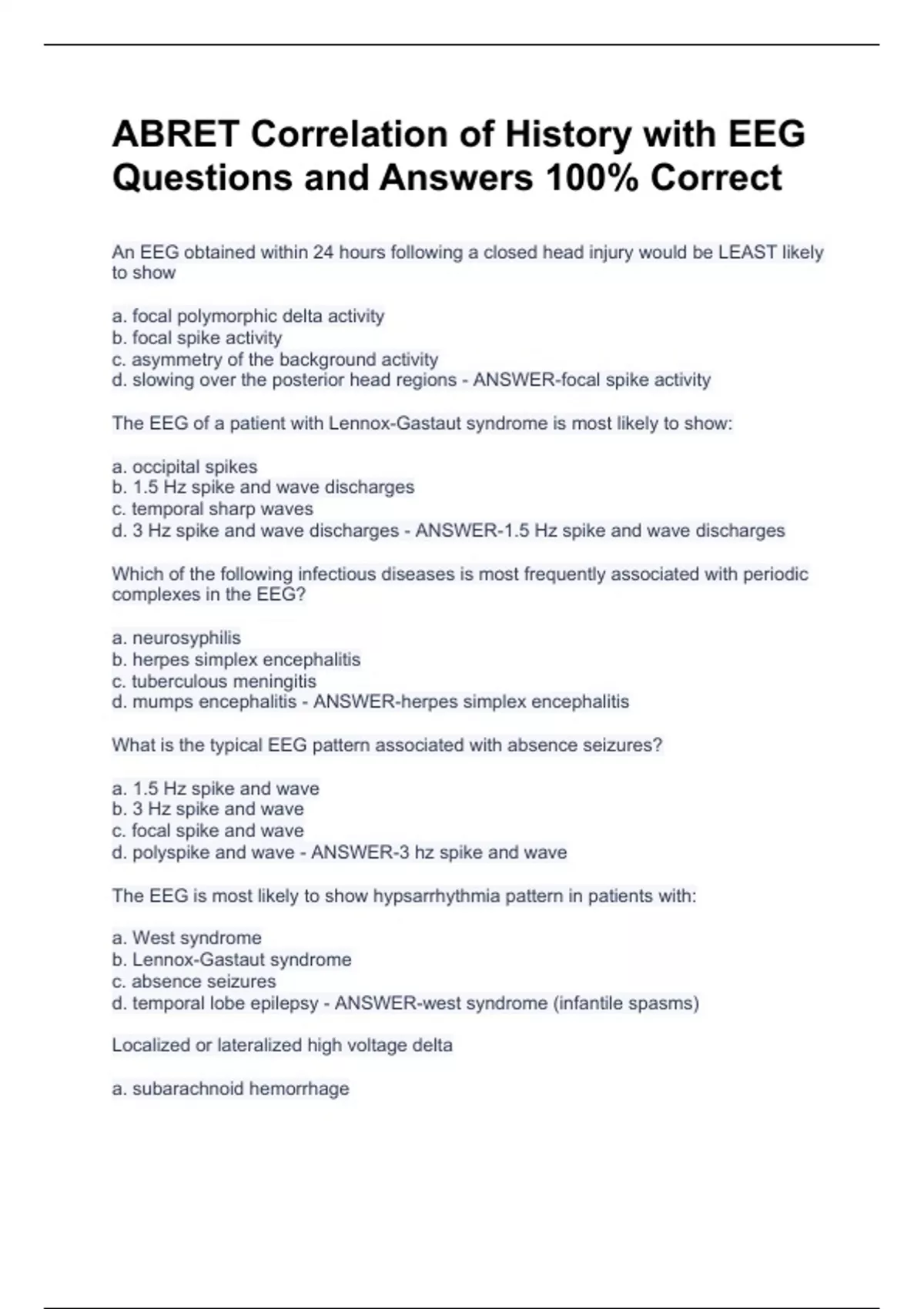 ABRET Correlation of History with EEG Questions and Answers 100% CorrectABRET Correlation of History with EEG Questions and Answers 100% CorrectABRET Correlation of History with EEG Questions and Answers 100% CorrectABRET Correlation of History with EEG Questions and Answers 100% CorrectABRET Correlation of History with EEG Questions and Answers 100% Correct An EEG obtained within 24 hours following a closed head injury would be LEAST likely to show a. focal polymorphic delta activity b. focal spike activity c. asymmetry of the background activity d. slowing over the posterior head regions - ANSWER-focal spike activity The EEG of a patient with Lennox-Gastaut syndrome is most likely to show: a. occipital spikes b. 1.5 Hz spike and wave discharges c. temporal sharp waves d. 3 Hz spike and wave discharges - ANSWER-1.5 Hz spike and wave discharges Which of the following infectious diseases is most frequently associated with periodic complexes in the EEG? a. neurosyphilis b. herpes simplex encephalitis c. tuberculous meningitis d. mumps encephalitis - ANSWER-herpes simplex encephalitis What is the typical EEG pattern associated with absence seizures? a. 1.5 Hz spike and wave b. 3 Hz spike and wave c. focal spike and wave d. polyspike and wave - ANSWER-3 hz spike and wave The EEG is most likely to show hypsarrhythmia pattern in patients with: a. West syndrome b. Lennox-Gastaut syndrome c. absence seizures d. temporal lobe epilepsy - ANSWER-west syndrome (infantile spasms) Localized or lateralized high voltage delta a. subarachnoid hemorrhage