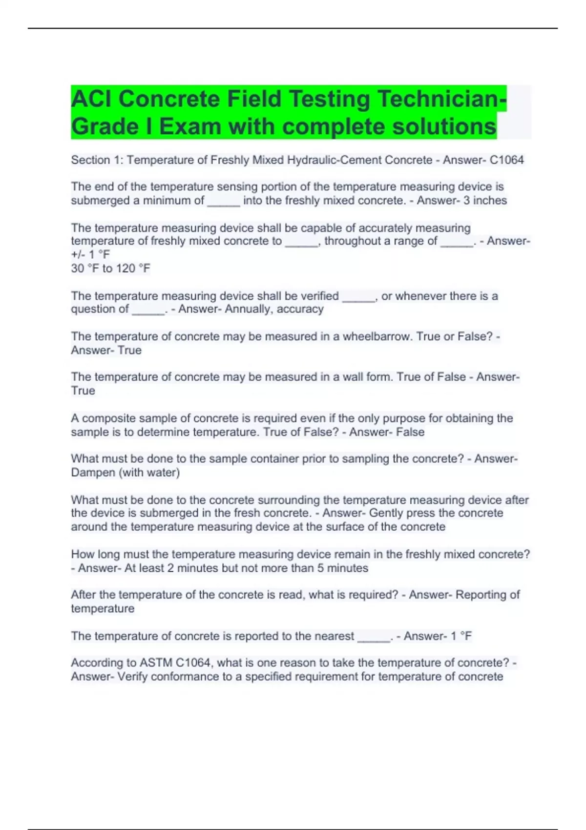 ACI Concrete Field Testing Technician- Grade I Exam with complete solutions