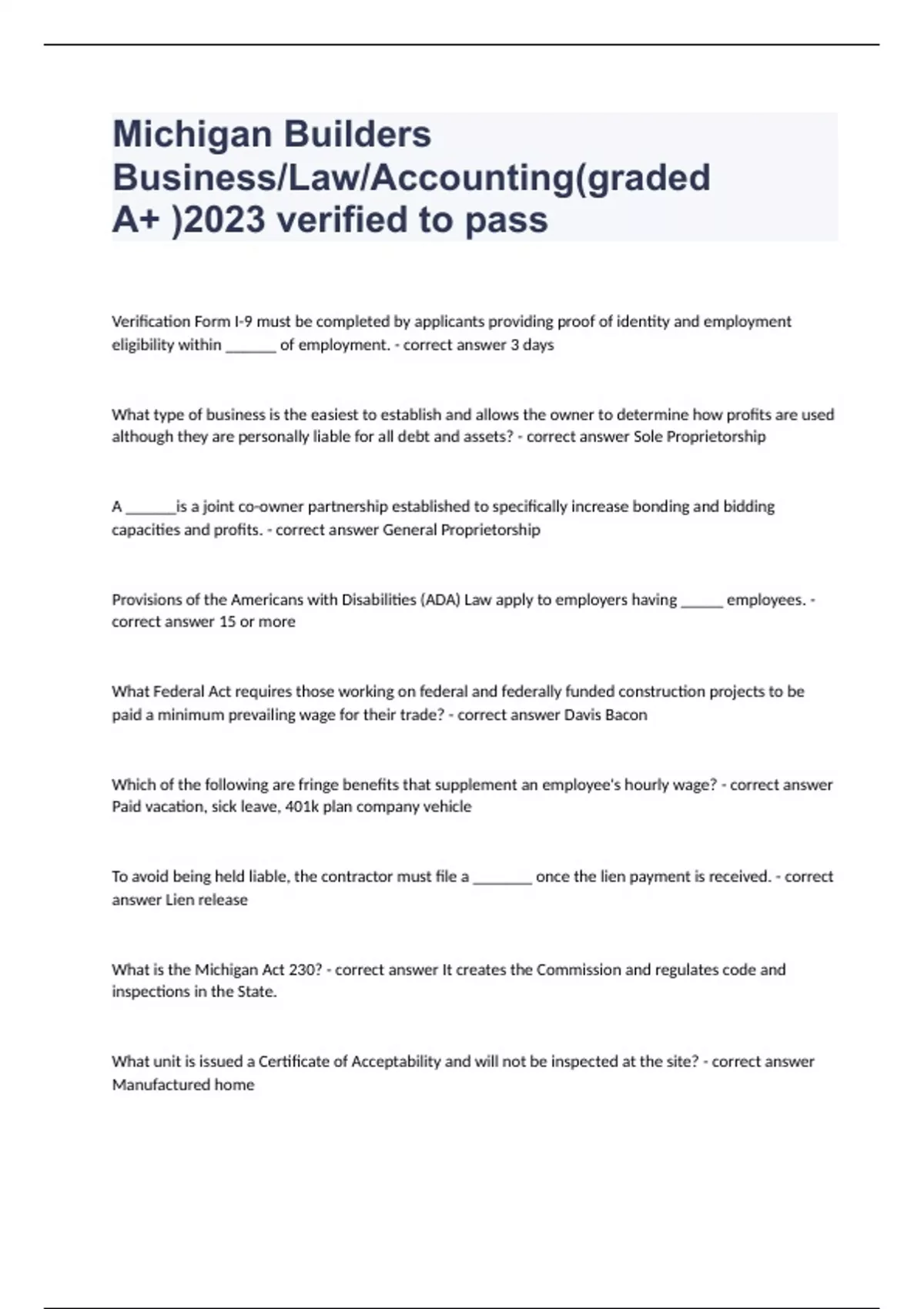 Michigan Builders Business/Law/Accounting(graded A+ )2023 verified to pass Verification Form I-9 must be completed by applicants providing proof of identity and employment eligibility within ______ of employment. - correct answer 3 days What type of business is the easiest to establish and allows the owner to determine how profits are used although they are personally liable for all debt and assets? - correct answer Sole Proprietorship A ______is a joint co-owner partnership established to specifically increase bonding and bidding capacities and profits. - correct answer General Proprietorship Provisions of the Americans with Disabilities (ADA) Law apply to employers having _____ employees. - correct answer 15 or more What Federal Act requires those working on federal and federally funded construction projects to be paid a minimum prevailing wage for their trade? - correct answer Davis Bacon Which of the following are fringe benefits that supplement an employee's hourly wage? - correct answer Paid vacation, sick leave, 401k plan company vehicle To avoid being held liable, the contractor must file a _______ once the lien payment is received. - correct answer Lien release What is the Michigan Act 230? - correct answer It creates the Commission and regulates code and inspections in the State. What unit is issued a Certificate of Acceptability and will not be inspected at the site? - correct answer Manufactured home