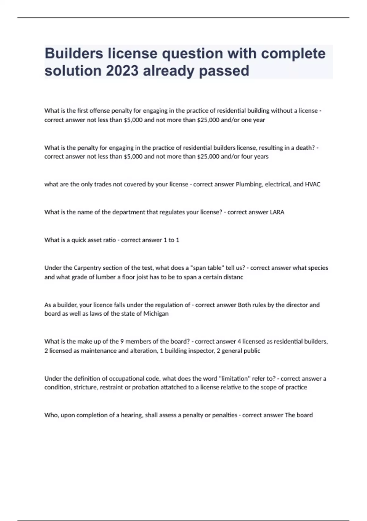 Builders license question with complete solution 2023 already passedWhat is the first offense penalty for engaging in the practice of residential building without a license - correct answer not less than $5,000 and not more than $25,000 and/or one year What is the penalty for engaging in the practice of residential builders license, resulting in a death? - correct answer not less than $5,000 and not more than $25,000 and/or four years what are the only trades not covered by your license - correct answer Plumbing, electrical, and HVAC What is the name of the department that regulates your license? - correct answer LARA What is a quick asset ratio - correct answer 1 to 1 Under the Carpentry section of the test, what does a "span table" tell us? - correct answer what species and what grade of lumber a floor joist has to be to span a certain distanc As a builder, your licence falls under the regulation of - correct answer Both rules by the director and board as well as laws of the state of Michigan What is the make up of the 9 members of the board? - correct answer 4 licensed as residential builders, 2 licensed as maintenance and alteration, 1 building inspector, 2 general public Under the definition of occupational code, what does the word "limitation" refer to? - correct answer a condition, stricture, restraint or probation attatched to a license relative to the scope of practice Who, upon completion of a hearing, shall assess a penalty or penalties - correct answer The board