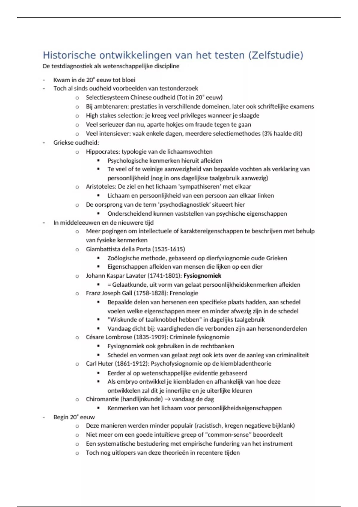 Dit document omvat een samenvatting van het onderdeel dat zelfstudie is van het vak 'inleiding in de psychodiagnostiek', namelijk de historische ontwikkeling van testen.
