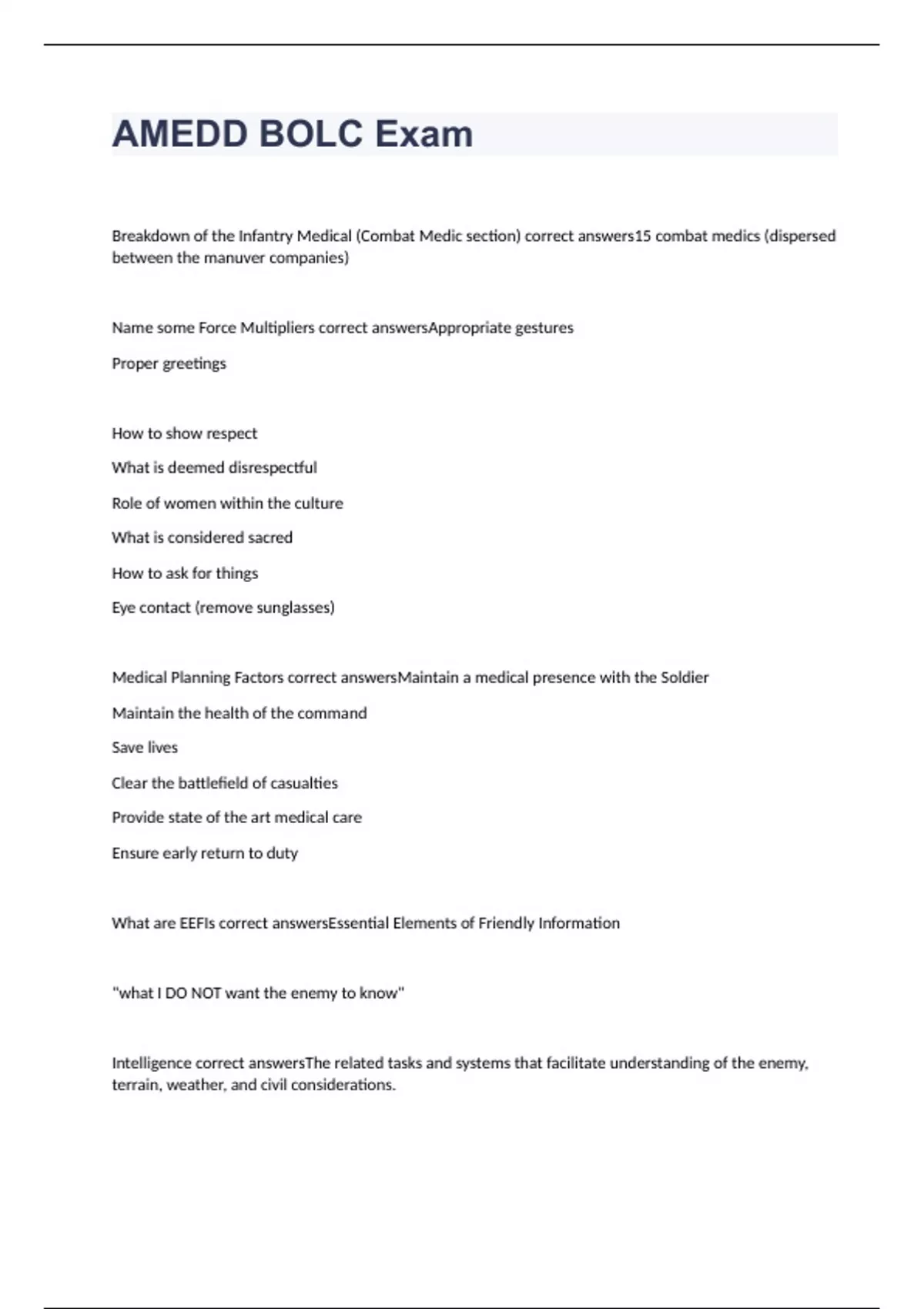 Breakdown of the Infantry Medical (Combat Medic section) correct answers15 combat medics (dispersed between the manuver companies) Name some Force Multipliers correct answersAppropriate gestures Proper greetings How to show respect What is deemed disrespectful Role of women within the culture What is considered sacred How to ask for things Eye contact (remove sunglasses) Medical Planning Factors correct answersMaintain a medical presence with the Soldier Maintain the health of the command Save lives Clear the battlefield of casualties Provide state of the art medical care Ensure early return to duty