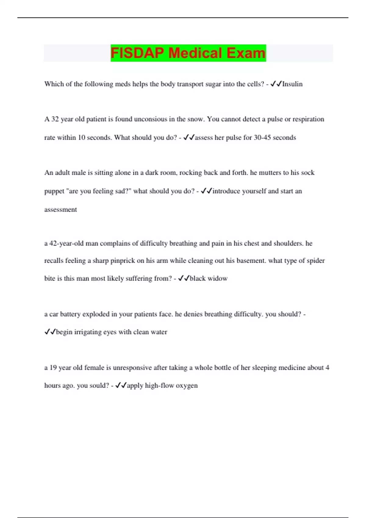 Which of the following meds helps the body transport sugar into the cells? - Insulin A 32 year old patient is found unconsious in the snow. You cannot detect a pulse or respiration rate within 10 seconds. What should you do? - assess her pulse for 30-45 seconds An adult male is sitting alone in a dark room, rocking back and forth. he mutters to his sock puppet "are you feeling sad?" what should you do? - introduce yourself and start an assessment a 42-year-old man complains of difficulty breathing and pain in his chest and shoulders. he recalls feeling a sharp pinprick on his arm while cleaning out his basement. what type of spider bite is this man most likely suffering from? - black widow a car battery exploded in your patients face. he denies breathing difficulty. you should? - begin irrigating eyes with clean water a 19 year old female is unresponsive after taking a whole bottle of her sleeping medicine about 4 hours ago. you sould? - apply high-flow oxygen