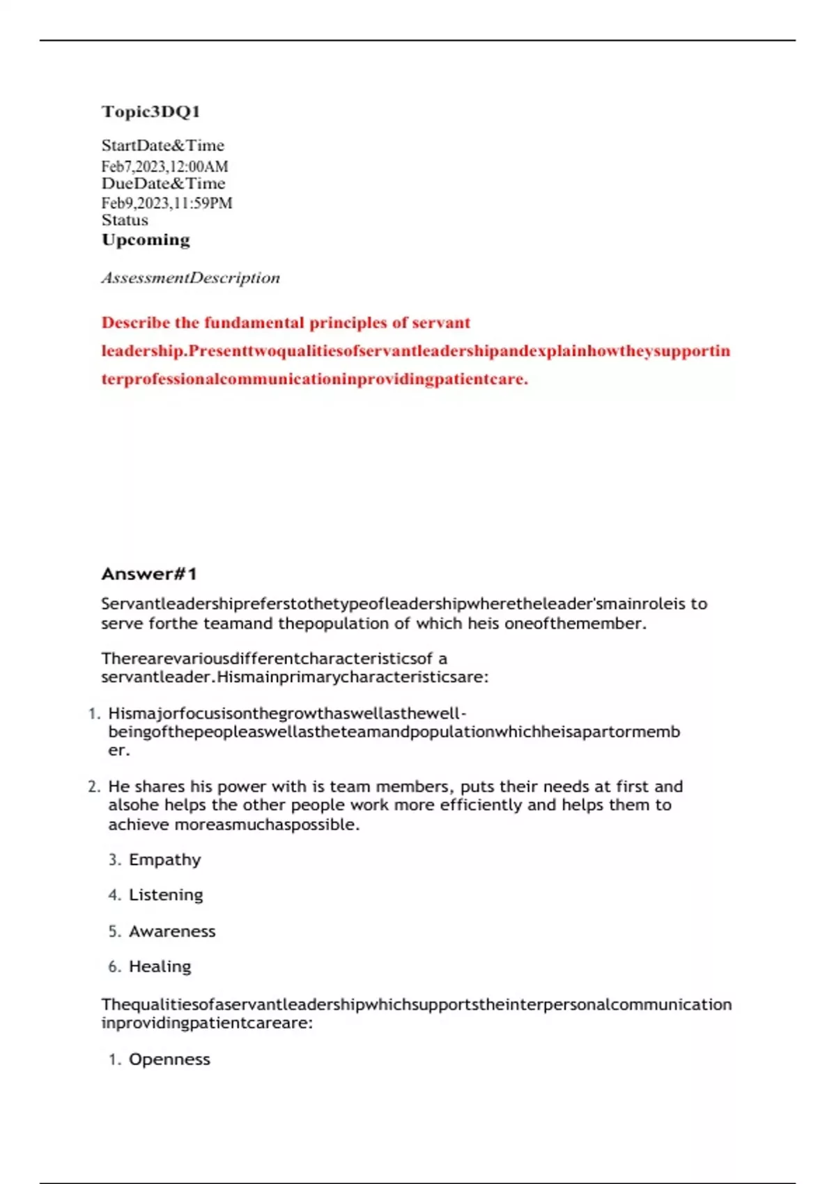 AssessmentDescription Describe the fundamental principles of servant leadership.Presenttwoqualitiesofservantleadershipandexplainhowtheysupportinterprofessionalcommunicationinprovidingpatientcare.