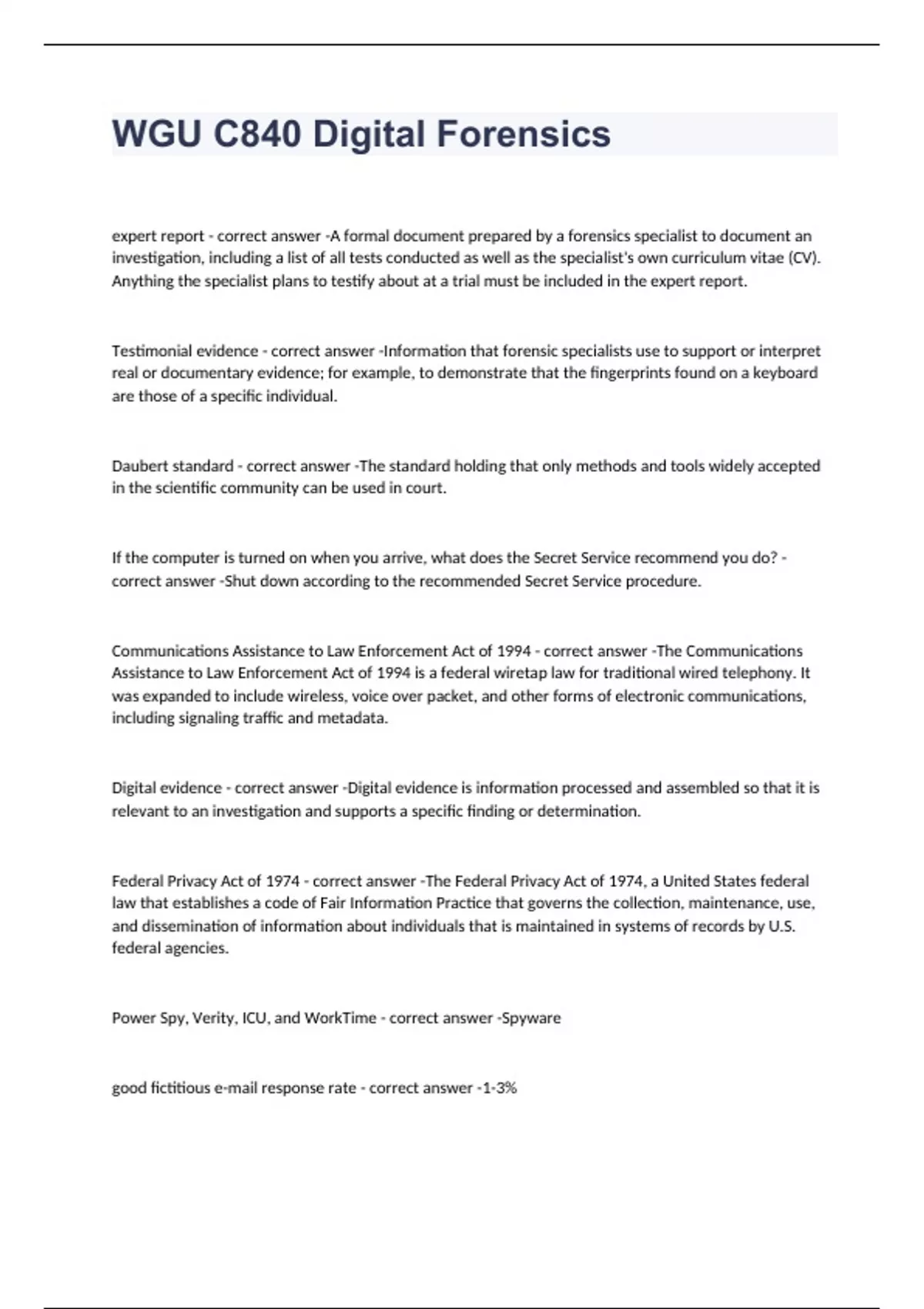 expert report A formal document prepared by a forensics specialist to document an investigation, including a list of all tests conducted as well as the specialist's own curriculum vitae (CV). Anything the specialist plans to testify about at a trial must be included in the expert report. Testimonial evidence Information that forensic specialists use to support or interpret real or documentary evidence; for example, to demonstrate that the fingerprints found on a keyboard are those of a specific individual. Daubert standard The standard holding that only methods and tools widely accepted in the scientific community can be used in court. If the computer is turned on when you arrive, what does the Secret Service recommend you do? Shut down according to the recommended Secret Service procedure. Communications Assistance to Law Enforcement Act of 1994 The Communications Assistance to Law Enforcement Act of 1994 is a federal wiretap law for traditional wired telephony. It was expanded to include wireless, voice over packet, and other forms of electronic communications, including signaling traffic and metadata. Digital evidence Digital evidence is information processed and assembled so that it is relevant to an investigation and supports a specific finding or determination. Federal Privacy Act of 1974 The Federal Privacy Act of 1974, a United States federal law that establishes a code of Fair Information Practice that governs the collection, maintenance, use, and dissemination of information about individuals that is maintained in systems of records by U.S. federal agencies. Power Spy, Verity, ICU, and WorkTime Spyware good fictitious e-mail response rate 1-3% Which crime is most likely to leave e-mail evidence? Cyberstalking