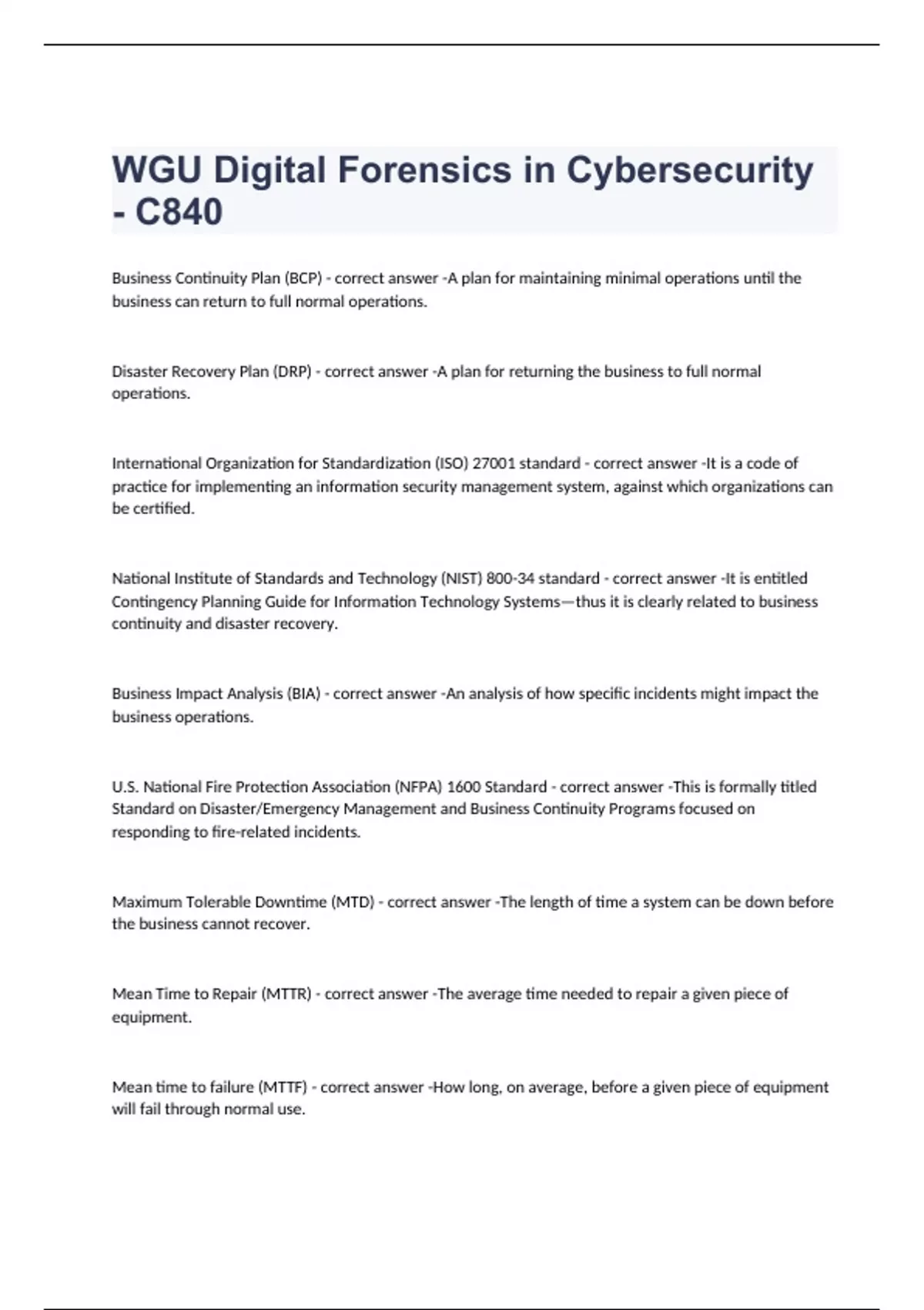 Business Continuity Plan (BCP) A plan for maintaining minimal operations until the business can return to full normal operations. Disaster Recovery Plan (DRP) A plan for returning the business to full normal operations. International Organization for Standardization (ISO) 27001 standard It is a code of practice for implementing an information security management system, against which organizations can be certified. National Institute of Standards and Technology (NIST) 800-34 standard It is entitled Contingency Planning Guide for Information Technology Systems—thus it is clearly related to business continuity and disaster recovery. Business Impact Analysis (BIA) An analysis of how specific incidents might impact the business operations. U.S. National Fire Protection Association (NFPA) 1600 Standard This is formally titled Standard on Disaster/Emergency Management and Business Continuity Programs focused on responding to fire-related incidents. Maximum Tolerable Downtime (MTD) The length of time a system can be down before the business cannot recover. Mean Time to Repair (MTTR) The average time needed to repair a given piece of equipment. Mean time to failure (MTTF) How long, on average, before a given piece of equipment will fail through normal use. Recovery Point Objective (RPO) The amount of work that might need to be redone, or data lost. Recovery Time Objective (RTO) The time that the system is expected to be back up. This must be less than MTD. Single Loss Expectancy (SLE) The expected monetary loss every time a risk occurs. Single Loss Expectancy (SLE) formula Asset Value (AV) x Exposure Factor (EF)