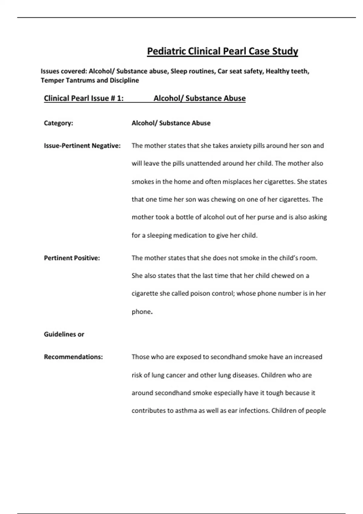 Pediatric Clinical Pearl Case Study.Issues covered: Alcohol/ Substance abuse, Sleep routines, Car seat safety, Healthy teeth, Temper Tantrums and Discipline Clinical Pearl Issue # 1: Alcohol/ Substance Abuse Category: Alcohol/ Substance Abuse Issue-Pertinent Negative: The mother states that she takes anxiety pills around her son and will leave the pills unattended around her child. The mother also smokes in the home and often misplaces her cigarettes. She states that one time her son was chewing on one of her cigarettes. The mother took a bottle of alcohol out of her purse and is also asking for a sleeping medication to give her child.