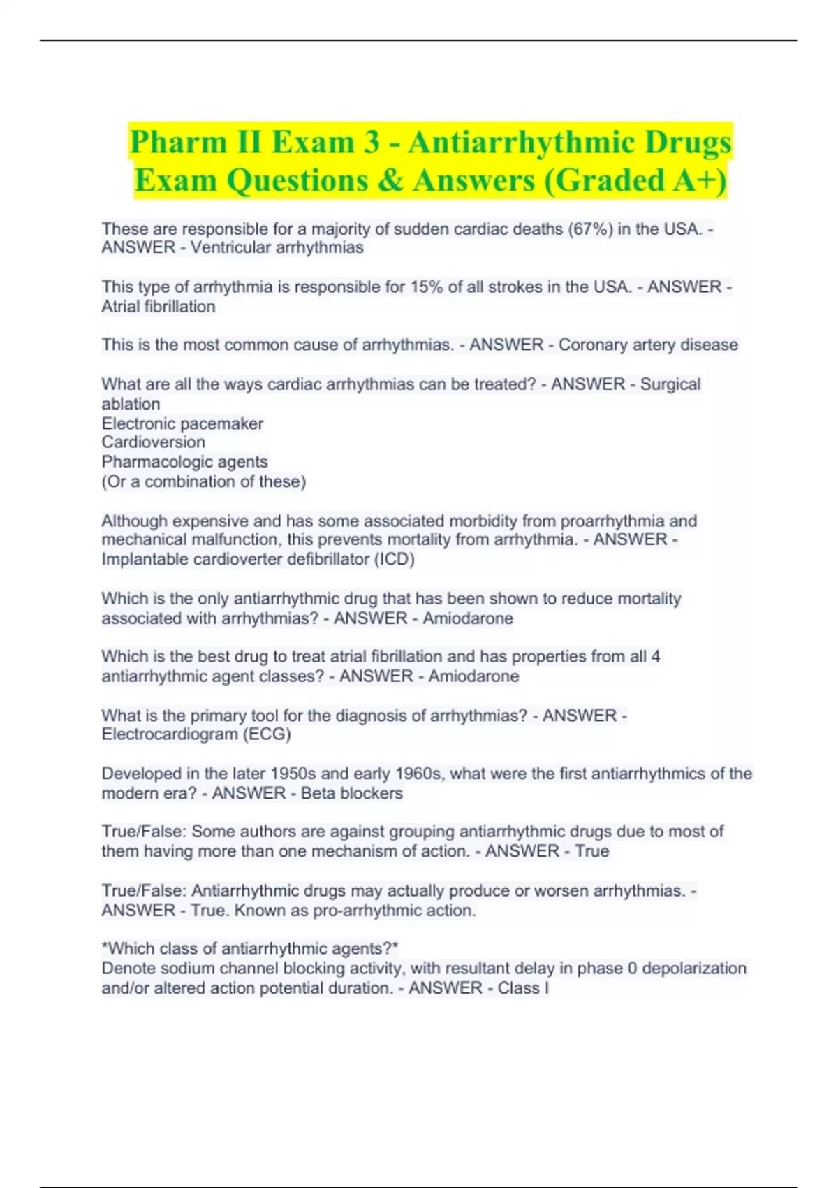 Pharm II Exam 3 - Antiarrhythmic Drugs Exam Questions & Answers (Graded A+) Pharm II Exam 3 - Antiarrhythmic Drugs Exam Questions & Answers (Graded A+) These are responsible for a majority of sudden cardiac deaths (67%) in the USA. - ANSWER - Ventricular arrhythmias This type of arrhythmia is responsible for 15% of all strokes in the USA. - ANSWER - Atrial fibrillation This is the most common cause of arrhythmias. - ANSWER - Coronary artery disease What are all the ways cardiac arrhythmias can be treated? - ANSWER - Surgical ablation Electronic pacemaker Cardioversion Pharmacologic agents (Or a combination of these) Although expensive and has some associated morbidity from proarrhythmia and mechanical malfunction, this prevents mortality from arrhythmia. - ANSWER - Implantable cardioverter defibrillator (ICD) Which is the only antiarrhythmic drug that has been shown to reduce mortality associated with arrhythmias? - ANSWER - Amiodarone Which is the best drug to treat atrial fibrillation and has properties from all 4 antiarrhythmic agent classes? - ANSWER - Amiodarone What is the primary tool for the diagnosis of arrhythmias? - ANSWER - Electrocardiogram (ECG) Developed in the later 1950s and early 1960s, what were the first antiarrhythmics of the modern era? - ANSWER - Beta blockers True/False: Some authors are against grouping antiarrhythmic drugs due to most of them having more than one mechanism of action. - ANSWER - True True/False: Antiarrhythmic drugs may actually produce or worsen arrhythmias. - ANSWER - True. Known as pro-arrhythmic action. *Which class of antiarrhythmic agents?* Denote sodium channel blocking activity, with resultant delay in phase 0 depolarization and/or altered action potential duration. - ANSWER - Class I