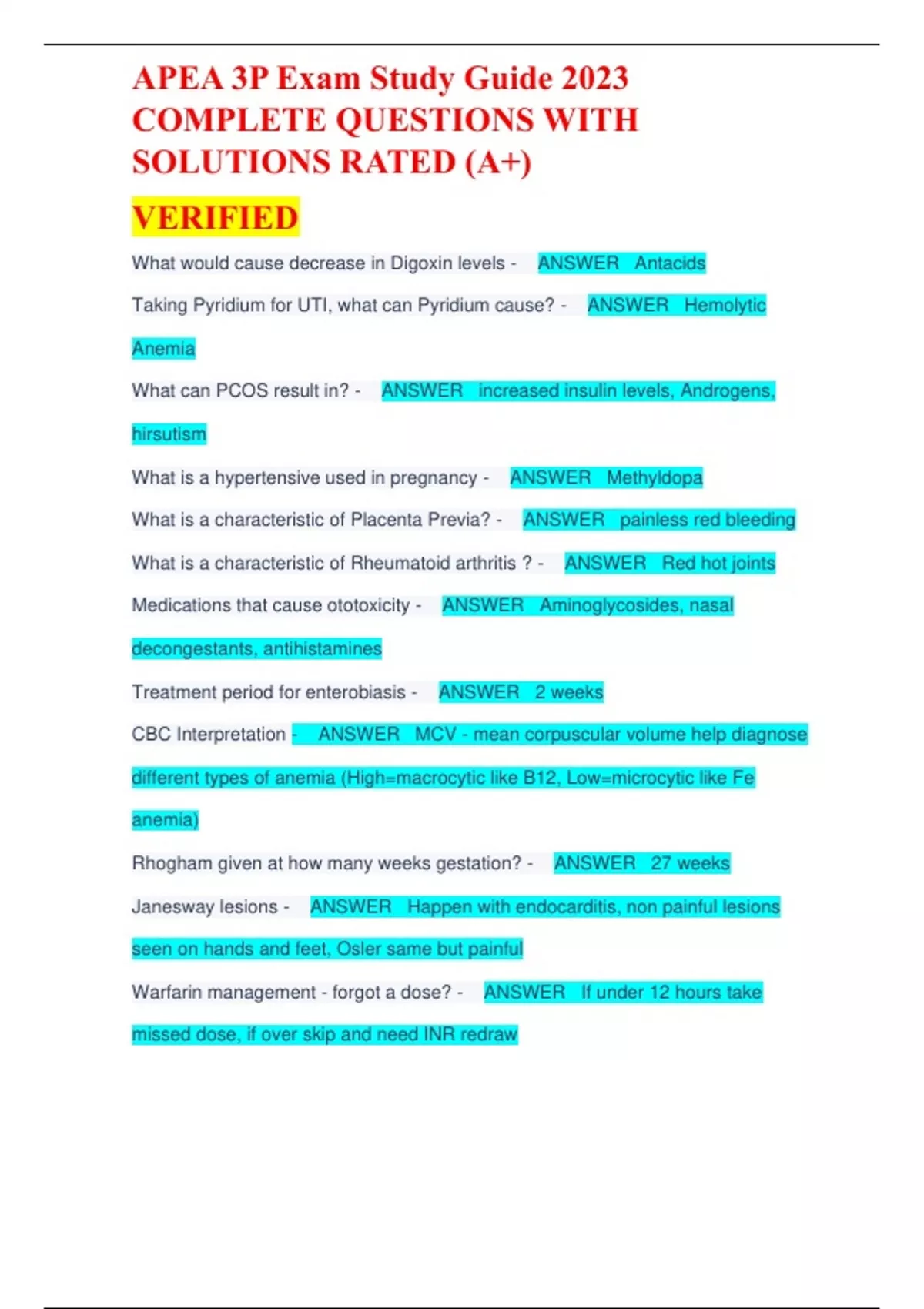 What would cause decrease in Digoxin levels - ANSWER Antacids Taking Pyridium for UTI, what can Pyridium cause? - ANSWER Hemolytic Anemia What can PCOS result in? - ANSWER increased insulin levels, Androgens, hirsutism What is a hypertensive used in pregnancy - ANSWER Methyldopa What is a characteristic of Placenta Previa? - ANSWER painless red bleeding What is a characteristic of Rheumatoid arthritis ? - ANSWER Red hot joints Medications that cause ototoxicity - ANSWER Aminoglycosides, nasal decongestants, antihistamines Treatment period for enterobiasis - ANSWER 2 weeks CBC Interpretation - ANSWER MCV - mean corpuscular volume help diagnose different types of anemia (High=macrocytic like B12, Low=microcytic like Fe anemia) Rhogham given at how many weeks gestation? - ANSWER 27 weeks Janesway lesions - ANSWER Happen with endocarditis, non painful lesions seen on hands and feet, Osler same but painful Warfarin management - forgot a dose? - ANSWER If under 12 hours take missed dose, if over skip and need INR redraw Taking an ACE or ARB what to know? - ANSWER ACE (dry hacking) cough starts 1-2 weeks after med started, ACE (Lol) ARB (sartan) first line in HTN avoid initially in african americans, angioedema can occur Contraindication for hydrochlorithiazide - ANSWER sulfa allergy, asthma, PCN hypersensitvity Murmurs Systolic - ANSWER MR=Mitral regurge (SOB/Fatigue HF) Peyton Manning=phys murmur (asymptomatic) AS=Aortic Stenosis (Angina, syncope HF) MVP=Mitral valve prolapse (palps,