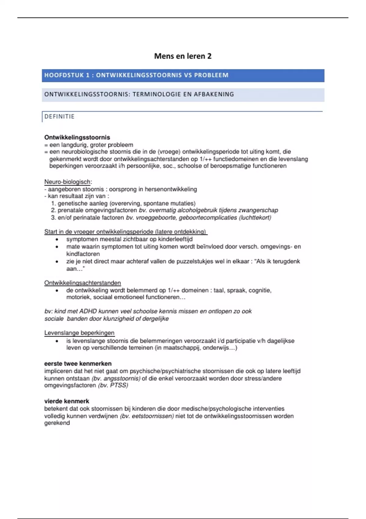 Dit document bevat een uitgebreide samenvatting van het vak 'mens en leren 2'. De samenvatting bestaat uit de powerpoints, extra notities, tips voor het examen en uitgewerkte casussen ter voorbereiding van het examen.