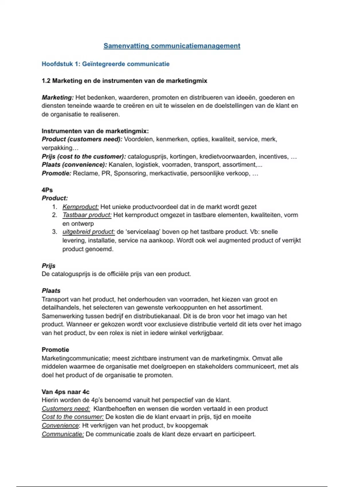 Volledige samenvatting van het vak marketingcommunicatie en PR gegevan in het eerste jaar communicatie. Lector: Coomans/Hoebers/Meers