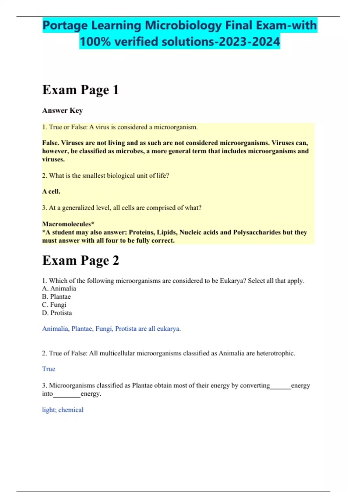 Portage Learning Microbiology Final Exam-with 100% verified solutions-