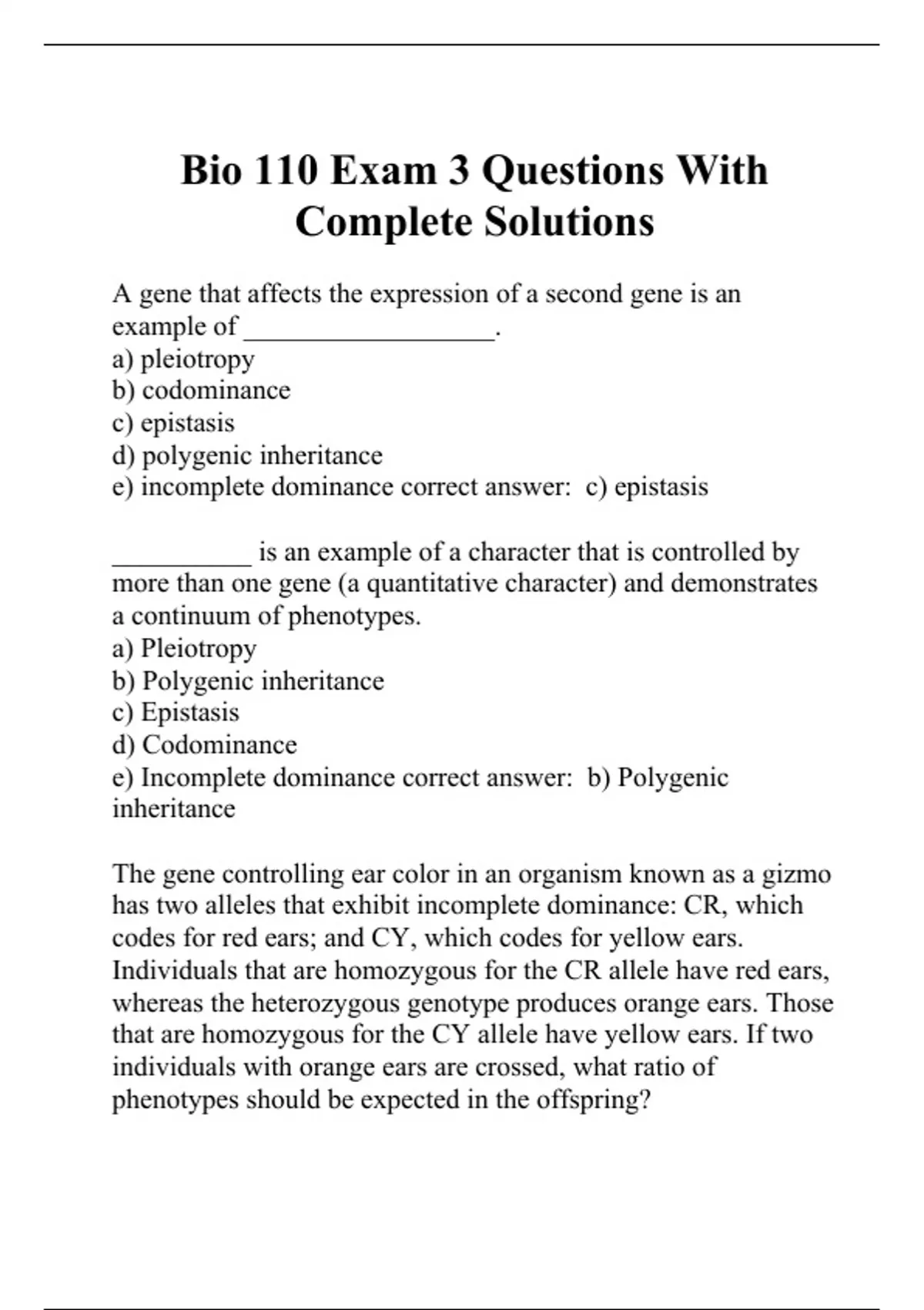 A gene that affects the expression of a second gene is an example of __________________. a) pleiotropy b) codominance c) epistasis d) polygenic inheritance e) incomplete dominance correct answer: c) epistasis __________ is an example of a character that is controlled by more than one gene (a quantitative character) and demonstrates a continuum of phenotypes. a) Pleiotropy b) Polygenic inheritance c) Epistasis d) Codominance e) Incomplete dominance correct answer: b) Polygenic inheritance The gene controlling ear color in an organism known as a gizmo has two alleles that exhibit incomplete dominance: CR, which codes for red ears; and CY, which codes for yellow ears. Individuals that are homozygous for the CR allele have red ears, whereas the heterozygous genotype produces orange ears. Those that are homozygous for the CY allele have yellow ears. If two individuals with orange ears are crossed, what ratio of phenotypes should be expected in the offspring? a) 9:3:1, red:yellow:orange ears b) 3:1, red:yellow ears c) 1:2:1, red:orange:yellow ears d) 1:2:1, red:yellow:orange ears e) 1:3, red:yellow ears correct answer: c) 1:2:1, red:orange:yellow ears Mice with the genotypes BBCc and bbcc are crossed. The alleles for brown coat (b) and no pigment (c) are recessive, and black coat (B) is dominant. What color of mice would NOT be produced by this mating? a) brown b) white c) black correct answer: a) brown An individual that is heterozygous for an allele and that exhibits a phenotype intermediate between that of the two homozygous alternatives is an example of _____. a) polygenic inheritance b) pleiotropy c) codominance