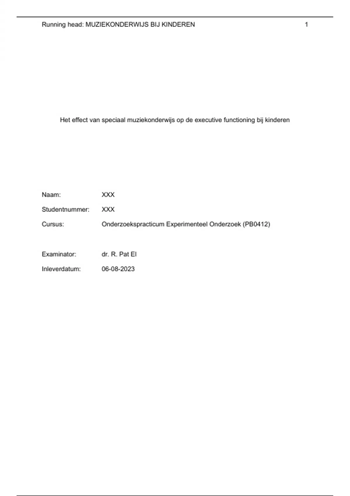 Eindverslag tentamenopdracht PB0412. Experimenteel Onderzoek. Het effect van muziekonderwijs op het executief functioneren bij kinderen. Eindcijfer: 8. Het verslag kan gebruikt worden ter inspiratie bij het schrijven van je eigen verslag.