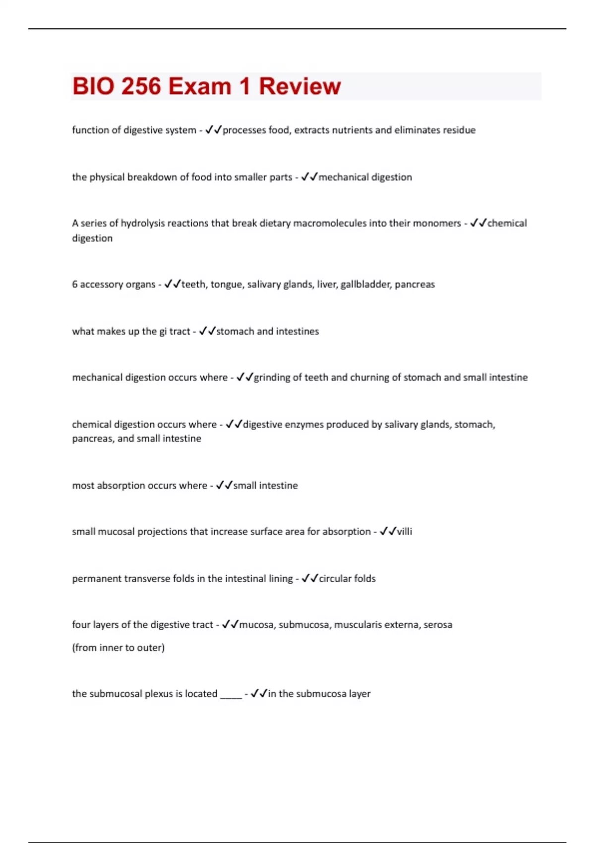 function of digestive system - processes food, extracts nutrients and eliminates residue the physical breakdown of food into smaller parts - mechanical digestion A series of hydrolysis reactions that break dietary macromolecules into their monomers - chemical digestion 6 accessory organs - teeth, tongue, salivary glands, liver, gallbladder, pancreas what makes up the gi tract - stomach and intestines mechanical digestion occurs where - grinding of teeth and churning of stomach and small intestine chemical digestion occurs where - digestive enzymes produced by salivary glands, stomach, pancreas, and small intestine most absorption occurs where - small intestine small mucosal projections that increase surface area for absorption - villi permanent transverse folds in the intestinal lining - circular folds four layers of the digestive tract - mucosa, submucosa, muscularis externa, serosa (from inner to outer) the submucosal plexus is located ____ - in the submucosa layer
