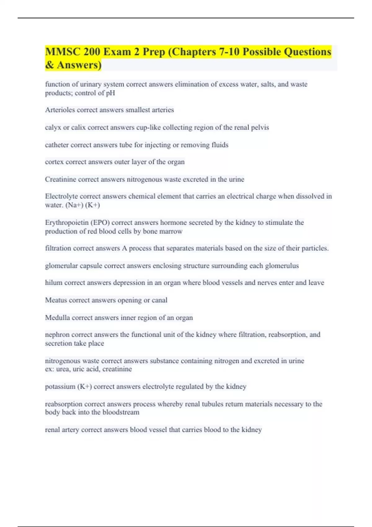 function of urinary system correct answers elimination of excess water, salts, and waste products; control of pH Arterioles correct answers smallest arteries calyx or calix correct answers cup-like collecting region of the renal pelvis catheter correct answers tube for injecting or removing fluids cortex correct answers outer layer of the organ Creatinine correct answers nitrogenous waste excreted in the urine Electrolyte correct answers chemical element that carries an electrical charge when dissolved in water. (Na+) (K+) Erythropoietin (EPO) correct answers hormone secreted by the kidney to stimulate the production of red blood cells by bone marrow filtration correct answers A process that separates materials based on the size of their particles. glomerular capsule correct answers enclosing structure surrounding each glomerulus hilum correct answers depression in an organ where blood vessels and nerves enter and leave Meatus correct answers opening or canal Medulla correct answers inner region of an organ nephron correct answers the functional unit of the kidney where filtration, reabsorption, and secretion take place nitrogenous waste correct answers substance containing nitrogen and excreted in urine ex: urea, uric acid, creatinine potassium (K+) correct answers electrolyte regulated by the kidney reabsorption correct answers process whereby renal tubules return materials necessary to the body back into the bloodstream renal artery correct answers blood vessel that carries blood to the kidney