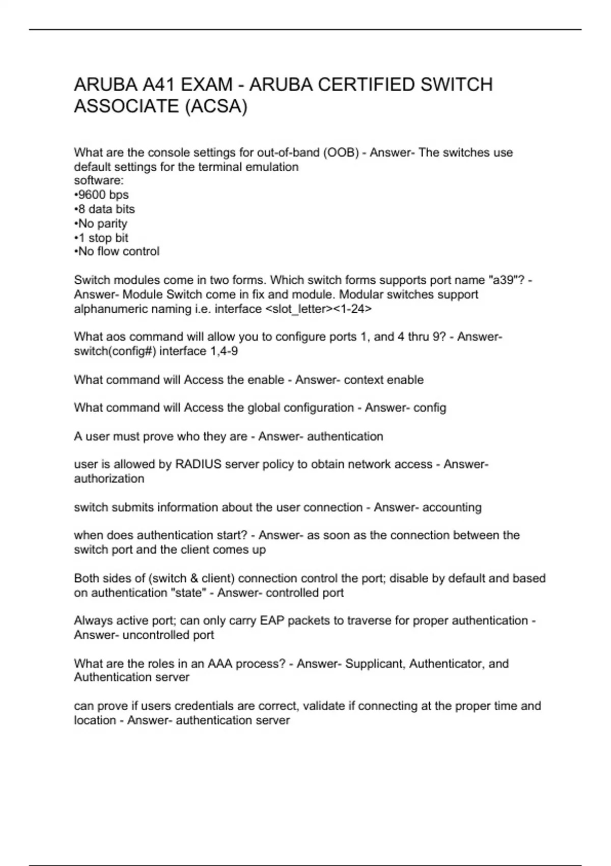 What are the console settings for out-of-band (OOB) - Answer- The switches use default settings for the terminal emulation software: •9600 bps •8 data bits •No parity •1 stop bit •No flow control Switch modules come in two forms. Which switch forms supports port name "a39"? - Answer- Module Switch come in fix and module. Modular switches support alphanumeric naming i.e. interface <slot_letter><1-24> What aos command will allow you to configure ports 1, and 4 thru 9? - Answer- switch(config#) interface 1,4-9 What command will Access the enable - Answer- context enable What command will Access the global configuration - Answer- config A user must prove who they are - Answer- authentication user is allowed by RADIUS server policy to obtain network access - Answer- authorization switch submits information about the user connection - Answer- accounting when does authentication start? - Answer- as soon as the connection between the switch port and the client comes up Both sides of (switch & client) connection control the port; disable by default and based on authentication "state" - Answer- controlled port Always active port; can only carry EAP packets to traverse for proper authentication - Answer- uncontrolled port What are the roles in an AAA process? - Answer- Supplicant, Authenticator, and Authentication server can prove if users credentials are correct, validate if connecting at the proper time and location - Answer- authentication server o