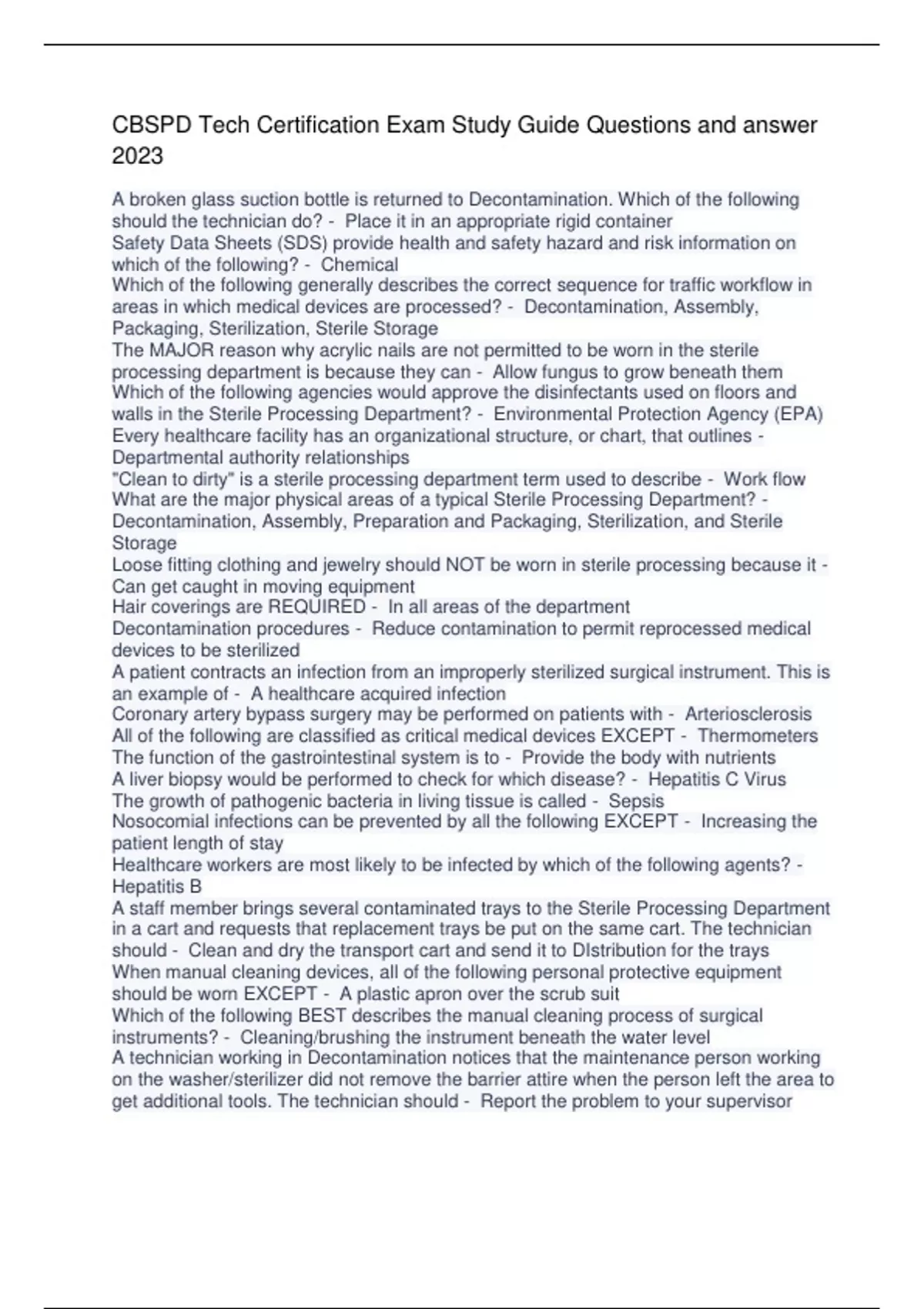 CBSPD Tech Certification Exam Study Guide Questions and answer 2023 A broken glass suction bottle is returned to Decontamination. Which of the following should the technician do? - Place it in an appropriate rigid container Safety Data Sheets (SDS) provide health and safety hazard and risk information on which of the following? - Chemical Which of the following generally describes the correct sequence for traffic workflow in areas in which medical devices are processed? - Decontamination, Assembly, Packaging, Sterilization, Sterile Storage The MAJOR reason why acrylic nails are not permitted to be worn in the sterile processing department is because they can - Allow fungus to grow beneath them Which of the following agencies would approve the disinfectants used on floors and walls in the Sterile Processing Department? - Environmental Protection Agency (EPA) Every healthcare facility has an organizational structure, or chart, that outlines - Departmental authority relationships "Clean to dirty" is a sterile processing department term used to describe - Work flow What are the major physical areas of a typical Sterile Processing Department? - Decontamination, Assembly, Preparation and Packaging, Sterilization, and Sterile Storage Loose fitting clothing and jewelry should NOT be worn in sterile processing because it - Can get caught in moving equipment Hair coverings are REQUIRED - In all areas of the department Decontamination procedures - Reduce contamination to permit reprocessed medical devices to be sterilized A patient contracts an infection from an improperly sterilized surgical instrument. This is an example of - A healthcare acquired infection Coronary artery bypass surgery may be performed on patients with - Arteriosclerosis All of the following are classified as critical medical devices EXCEPT - Thermometers The function of the gastrointestinal system is to - Provide the body with nutrients A liver biopsy would be performed to check for which disease? - Hepatitis C Virus The growth of pathogenic bacteria in living tissue is called - Sepsis Nosocomial infections can be prevented by all the following EXCEPT - Increasing the patient length of stay Healthcare