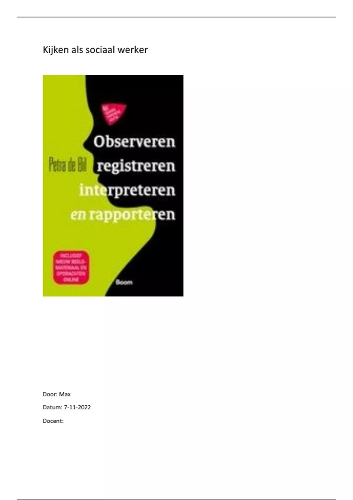 Hierin kunt u lezen hoe ik een voldoende heb gehaald voor de toets 1.1.2 Kijken als sociaal werker. Als ik het nog een keer zou doen zou ik alleen de APA verbeteren.