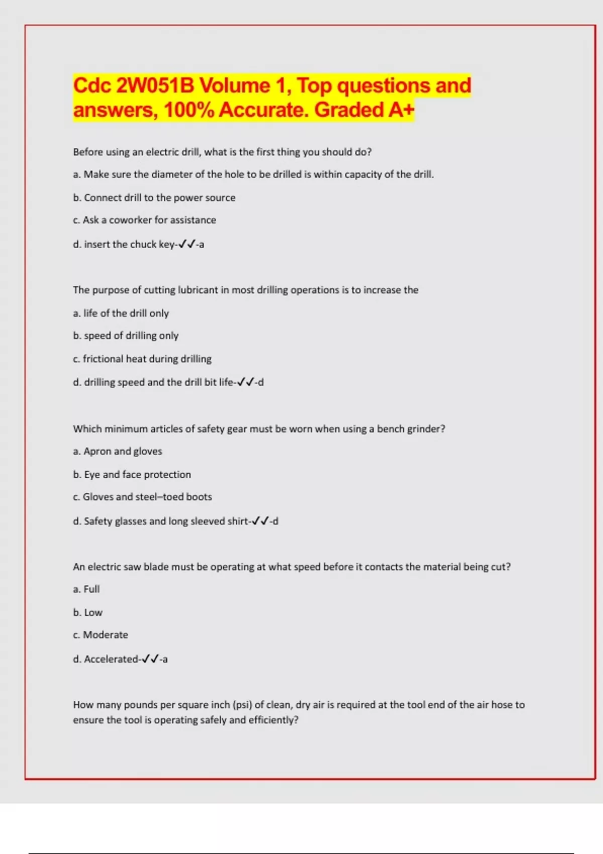 Cdc 2W051B Volume 1, Top questions and answers, 100% Accurate. Graded A+ Before using an electric drill, what is the first thing you should do? a. Make sure the diameter of the hole to be drilled is within capacity of the drill. b. Connect drill to the power source c. Ask a coworker for assistance d. insert the chuck key--a The purpose of cutting lubricant in most drilling operations is to increase the a. life of the drill only b. speed of drilling only c. frictional heat during drilling d. drilling speed and the drill bit life--d Which minimum articles of safety gear must be worn when using a bench grinder? a. Apron and gloves b. Eye and face protection c. Gloves and steel–toed boots d. Safety glasses and long sleeved shirt--d An electric saw blade must be operating at what speed before it contacts the material being cut? a. Full b. Low c. Moderate d. Accelerated--a How many pounds per square inch (psi) of clean, dry air is required at the tool end of the air hose to ensure the tool is operating safely and efficiently? a. 60