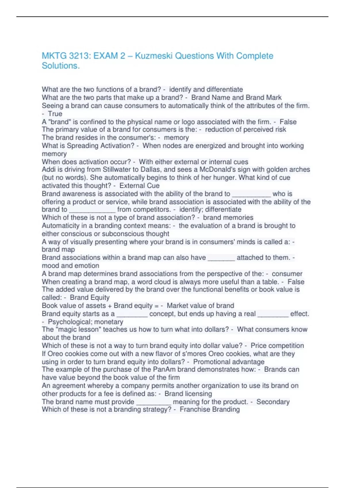 MKTG 3213: EXAM 2 – Kuzmeski Questions With Complete Solutions. What are the two functions of a brand? - identify and differentiate What are the two parts that make up a brand? - Brand Name and Brand Mark Seeing a brand can cause consumers to automatically think of the attributes of the firm. - True A "brand" is confined to the physical name or logo associated with the firm. - False The primary value of a brand for consumers is the: - reduction of perceived risk The brand resides in the consumer's: - memory What is Spreading Activation? - When nodes are energized and brought into working memory When does activation occur? - With either external or internal cues Addi is driving from Stillwater to Dallas, and sees a McDonald's sign with golden arches (but no words). She automatically begins to think of her hunger. What kind of cue activated this thought? - External Cue Brand awareness is associated with the ability of the brand to __________ who is offering a product or service, while brand association is associated with the ability of the brand to ____________ from competitors. - identify; differentiate Which of these is not a type of brand association? - brand memories Automaticity in a branding context means: - the evaluation of a brand is brought to either conscious or subconscious thought A way of visually presenting where your brand is in consumers' minds is called a: - brand map Brand associations within a brand map can also have _______ attached to them. - mood and emotion A brand map determines brand associations from the perspective of the: - consumer When creating a brand map, a word cloud is always more useful than a table. - False The added value delivered by the brand over the functional benefits or book value is called: - Brand Equity Book value of assets + Brand equity = - Market value of brand Brand equity starts as a ________ concept, but ends up having a real ________ effect. - Psychological; monetary The "magic lesson" teaches us how to turn what into dollars? - What consumers know about the brand Which of these is not a way to turn brand equity into dollar value? - Price competition If Oreo cookies come out with a new flavor of s'mores Oreo cookies, what are they using in order to turn brand equity into dollars? - Promotional advantage The example of the purchase of the PanAm brand demonstrates how: - Brands can have value beyond the book value of the firm An agreement whereby a company permits another organization to use its brand on other products for a fee is defined as: - Brand licensing The brand name must provide _________ meaning for the product. - Secondary Which of these is not a branding strategy? - Franchise Branding Unilever houses many brands, such as SlimFast nutrition drinks, Dove soap, and Skippy peanut butter, that all sell different products. What branding strategy is used here? - Individual branding Which of these is not a benefit of individual branding? - strong connections to established brands for new brands to lean on Which of these is not a benefit of institutional branding? - greater individualized identity for new products Which of these companies is more likely to use an institutional branding strategy for a new product or service? - Sony Which of these is not a benefit of sub-branding? - increased market share What is the main advantage of using a sub-branding strategy? - All of these Mostly, busin