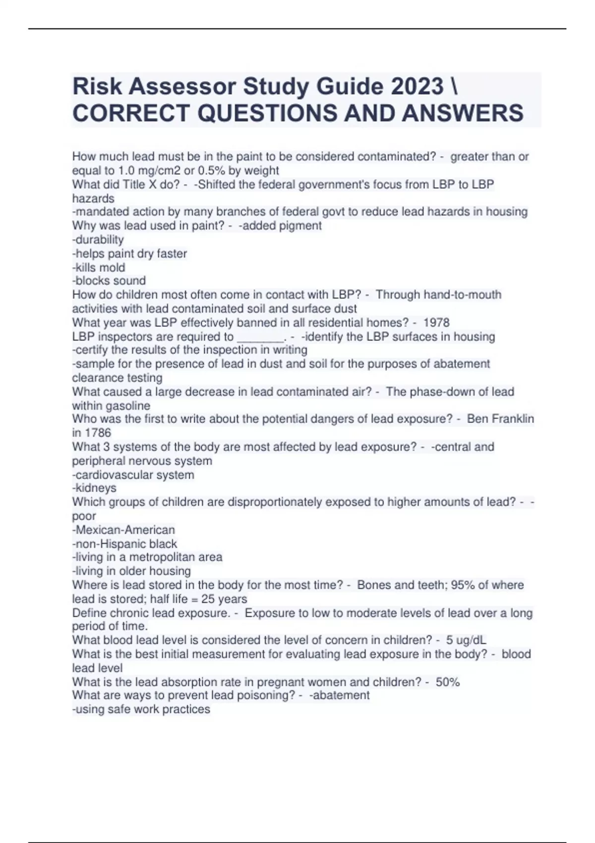 Risk Assessor Study Guide 2023 CORRECT QUESTIONS AND ANSWERS How much lead must be in the paint to be considered contaminated? - greater than or equal to 1.0 mg/cm2 or 0.5% by weight What did Title X do? - -Shifted the federal government's focus from LBP to LBP hazards -mandated action by many branches of federal govt to reduce lead hazards in housing Why was lead used in paint? - -added pigment -durability -helps paint dry faster -kills mold -blocks sound How do children most often come in contact with LBP? - Through hand-to-mouth activities with lead contaminated soil and surface dust What year was LBP effectively banned in all residential homes? - 1978 LBP inspectors are required to _______. - -identify the LBP surfaces in housing -certify the results of the inspection in writing -sample for the presence of lead in dust and soil for the purposes of abatement clearance testing What caused a large decrease in lead contaminated air? - The phase-down of lead within gasoline Who was the first to write about the potential dangers of lead exposure? - Ben Franklin in 1786 What 3 systems of the body are most affected by lead exposure? - -central and peripheral nervous system -cardiovascular system -kidneys Which groups of children are disproportionately exposed to higher amounts of lead? - -poor -Mexican-American -non-Hispanic black -living in a metropolitan area -living in older housing Where is lead stored in the body for the most time? - Bones and teeth; 95% of where lead is stored; half life = 25 years Define chronic lead exposure. - Exposure to low to moderate levels of lead over a long period of time. What blood lead level is considered the level of concern in children? - 5 ug/dL What is the best initial measurement for evaluating lead exposure in the body? - blood lead level What is the lead absorption rate in pregnant women and children? - 50% What are ways to prevent lead poisoning? - -abatement -using safe work practices -eating a balanced diet What is the first step in the treatment of suspected lead poisoning? - removing the person from further exposure to the lead What are the medications used for treating lead poisoning known as? - chelating agents When was Title X created? - 1992 What does Title X define LBP hazards as? - any condition that causes exposure to lead from lead-contaminated dust, soil, or paint that is deteriorated or present on accessible, friction, or impact surfaces that would result in adverse human health effects established by the appropriate Federal agency Where does the "lead based paint free" exemption apply? - in target housing that is being rented How often does Texas require a refresher to stay certified as an inspector? - every 2 years (others are every 3 years) What is a clearance level? - Values that indicate the max amount of lead allowed in dust on a surface following completion of a abatement activity. What is considered a child occupied facility? - a building or part of a building that was constructed before 1978 that is visited regularly by the same child, 6 y.o. or younger, at least 2 days a week for at least 3 hours a day, 60 hours a year. (day-care center, preschool, kindergarten classroom) Define: Inspection - a surface-by-surface investigation by a certified lead inspector/risk assessor to determine the presence of LBP including a written report explaining the results of the investigation. What conditions follow composite dust sampling? - - composite dust samples shall consist of at least two subsamples - every component that is being tested shall be included in the sampling - shall NOT consist of subsamples from more than one type of component What are the two types of errors that are possible in LBP testing? - - false negative - false positive What are the 2 types XRF's? - - direct reader - spectrum analyzer What are 2 radioactive materials that are used in XRF's? - - cobalt-57 isotope - cadmium-109 isotope The degree of damage suffered by an individual exposed to ionizing radiation is a function of which factors? - - type of radiation involved - chemical form of the radiation - distance from the source - energy - duration of exposure What is the main source of radiation that humans are exposed to? - natural background radiation (radon gas, naturally occurring radioactive elements, cosmic radiation from the sun and outer space) (about 300 mrem/year) What 3 factors affect your exposure to radiation? - - time - distance - shielding What is us