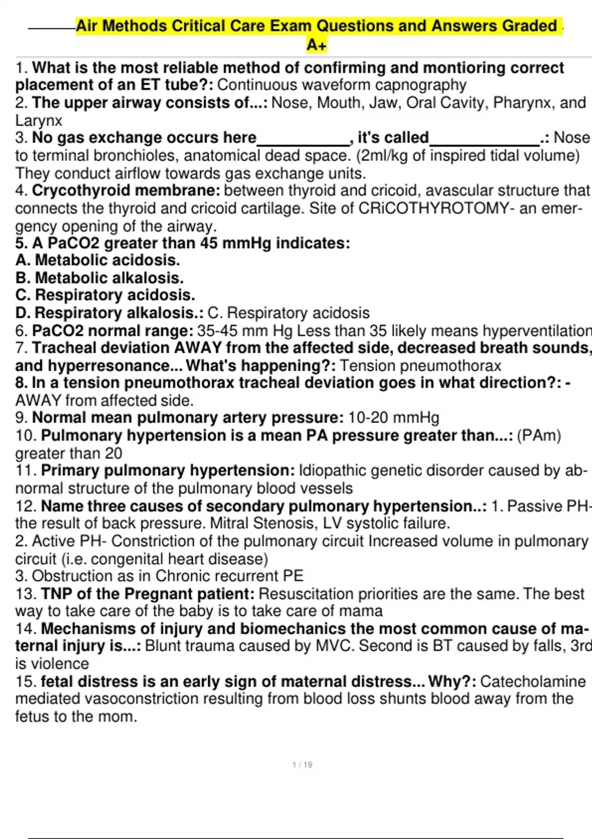 1 / 19 1. What is the most reliable method of confirming and montioring correct placement of an ET tube?: Continuous waveform capnography 2. The upper airway consists of...: Nose, Mouth, Jaw, Oral Cavity, Pharynx, and Larynx 3. No gas exchange occurs here , it's called .: Nose to terminal bronchioles, anatomical dead space. (2ml/kg of inspired tidal volume) They conduct airflow towards gas exchange units. 4. Crycothyroid membrane: between thyroid and cricoid, avascular structure that connects the thyroid and cricoid cartilage. Site of CRiCOTHYROTOMY- an emer- gency opening of the airway. 5. A PaCO2 greater than 45 mmHg indicates: A. Metabolic acidosis. B. Metabolic alkalosis. C. Respiratory acidosis. D. Respiratory alkalosis.: C. Respiratory acidosis 6. PaCO2 normal range: 35-45 mm Hg Less than 35 likely means hyperventilation 7. Tracheal deviation AWAY from the affected side, decreased breath sounds, and hyperresonance... What's happening?: Tension pneumothorax 8. In a tension pneumothorax tracheal deviation goes in what direction?: - AWAY from affected side. 9. Normal mean pulmonary artery pressure: 10-20 mmHg 10. Pulmonary hypertension is a mean PA pressure greater than...: (PAm) greater than 20 11. Primary pulmonary hypertension: Idiopathic genetic disorder caused by ab- normal structure of the pulmonary blood vessels 12. Name three causes of secondary pulmonary hypertension..: 1. Passive PH- the result of back pressure. Mitral Stenosis, LV systolic failure. 2. Active PH- Constriction of the pulmonary circuit Increased volume in pulmonary circuit (i.e. congenital heart disease) 3. Obstruction as in Chronic recurrent PE 13. TNP of the Pregnant patient: Resuscitation priorities are the same. The best way to take care of the baby is to take care of mama 14. Mechanisms of injury and biomechanics the most common cause of ma- ternal injury is...: Blunt trauma caused by MVC. Second is BT caused by falls, 3rd is violence 15. fetal distress is an early sign of maternal distress... Why?: Catecholamine mediated vasoconstriction resulting from blood loss shunts blood away from the fetus to the mom. Air Methods Critical Care Exam Questions and Answers Graded A+ 2 / 19 16. Fetal hypo perfusion is evidenced by....: Fetal tachycardia (140 to 160+) and fetal bradycardia 17. The FRC in a pregnant patient is....: Reduced by the gravid uterus lifting the diaphragm. 18. chest tube placement in a pregnant patient is 1-2 spaces higher: Because of the lifted diaphragm 19. What is the cause of physiological anemia in pregnant patients?: Hemodili- tional anemia occurs. Plasma volume increases 30-50%. 20. Preterm Labor (PTL): 21. abruptio placentae: premature separation of the placenta from the uterine wall 22. On a pregnant patient...: Chest compressions must be higher on the sternum. Any preg patient 20 weeks pregnant or more with a uterus above the umbilicus should have the uterus left laterally displaced during compressions to avoid aorto- caval compression. A 15 degree tilt of the long board or lateral displacement. 23. What is the Maternal Fetal Triage Index?: A valid reliable 5 level triage tool that may assist in the triage of obstetric trauma patients