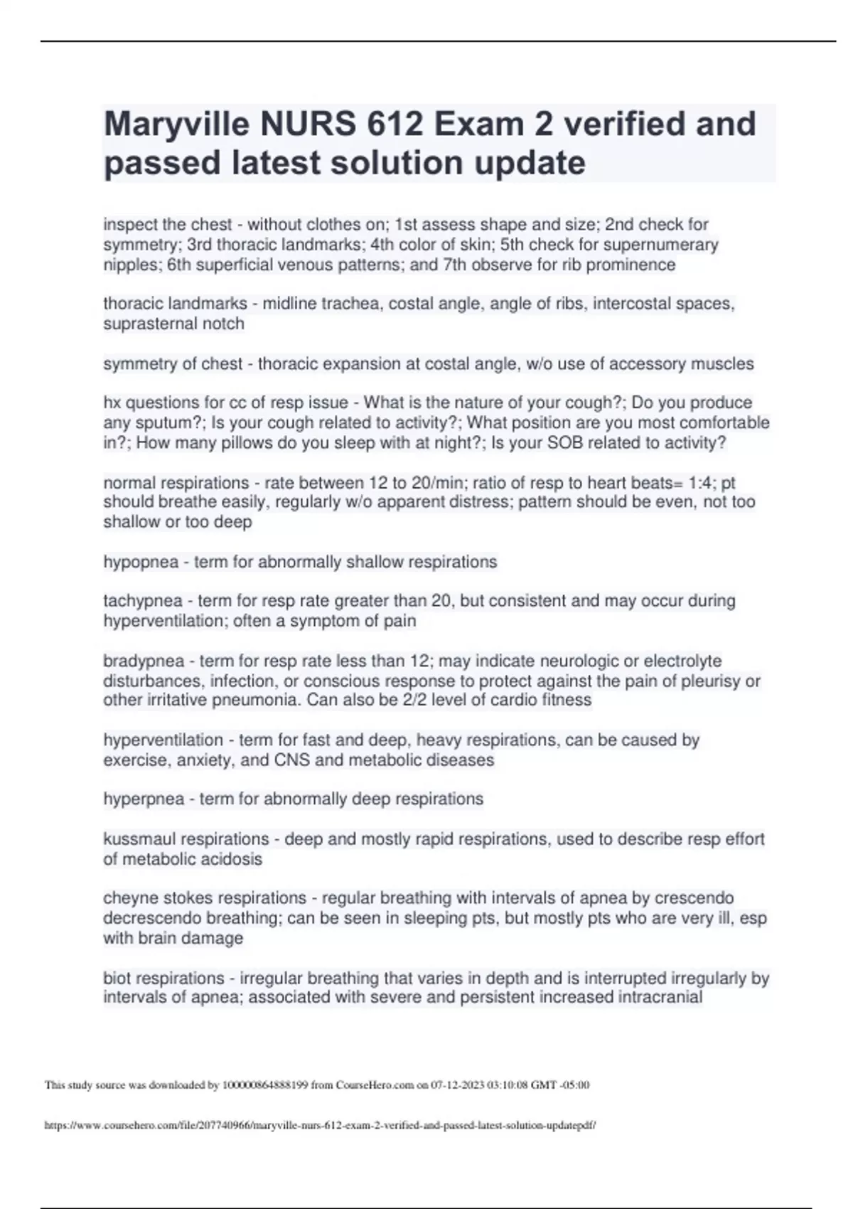 inspect the chest - without clothes on; 1st assess shape and size; 2nd check for symmetry; 3rd thoracic landmarks; 4th color of skin; 5th check for supernumerary nipples; 6th superficial venous patterns; and 7th observe for rib prominence thoracic landmarks - midline trachea, costal angle, angle of ribs, intercostal spaces, suprasternal notch symmetry of chest - thoracic expansion at costal angle, w/o use of accessory muscles hx questions for cc of resp issue - What is the nature of your cough?; Do you produce any sputum?; Is your cough related to activity?; What position are you most comfortable in?; How many pillows do you sleep with at night?; Is your SOB related to activity? normal respirations - rate between 12 to 20/min; ratio of resp to heart beats= 1:4; pt should breathe easily, regularly w/o apparent distress; pattern should be even, not too shallow or too deep hypopnea - term for abnormally shallow respirations tachypnea - term for resp rate greater than 20, but consistent and may occur during hyperventilation; often a symptom of pain bradypnea - term for resp rate less than 12; may indicate neurologic or electrolyte disturbances, infection, or conscious response to protect against the pain of pleurisy or other irritative pneumonia. Can also be 2/2 level of cardio fitness hyperventilation - term for fast and deep, heavy respirations, can be caused by exercise, anxiety, and CNS and metabolic diseases hyperpnea - term for abnormally deep respirations kussmaul respirations - deep and mostly rapid respirations, used to describe resp effort of metabolic acidosis cheyne stokes respirations - regular breathing with intervals of apnea by crescendo decrescendo breathing; can be seen in sleeping pts, but mostly pts who are very ill, esp with brain damage biot respirations - irregular breathing that varies in depth and is interrupted irregularly by intervals of apnea; associated with severe and persistent increased intracranial This study source was downloaded by from CourseH on :10:08 GMT -05:0