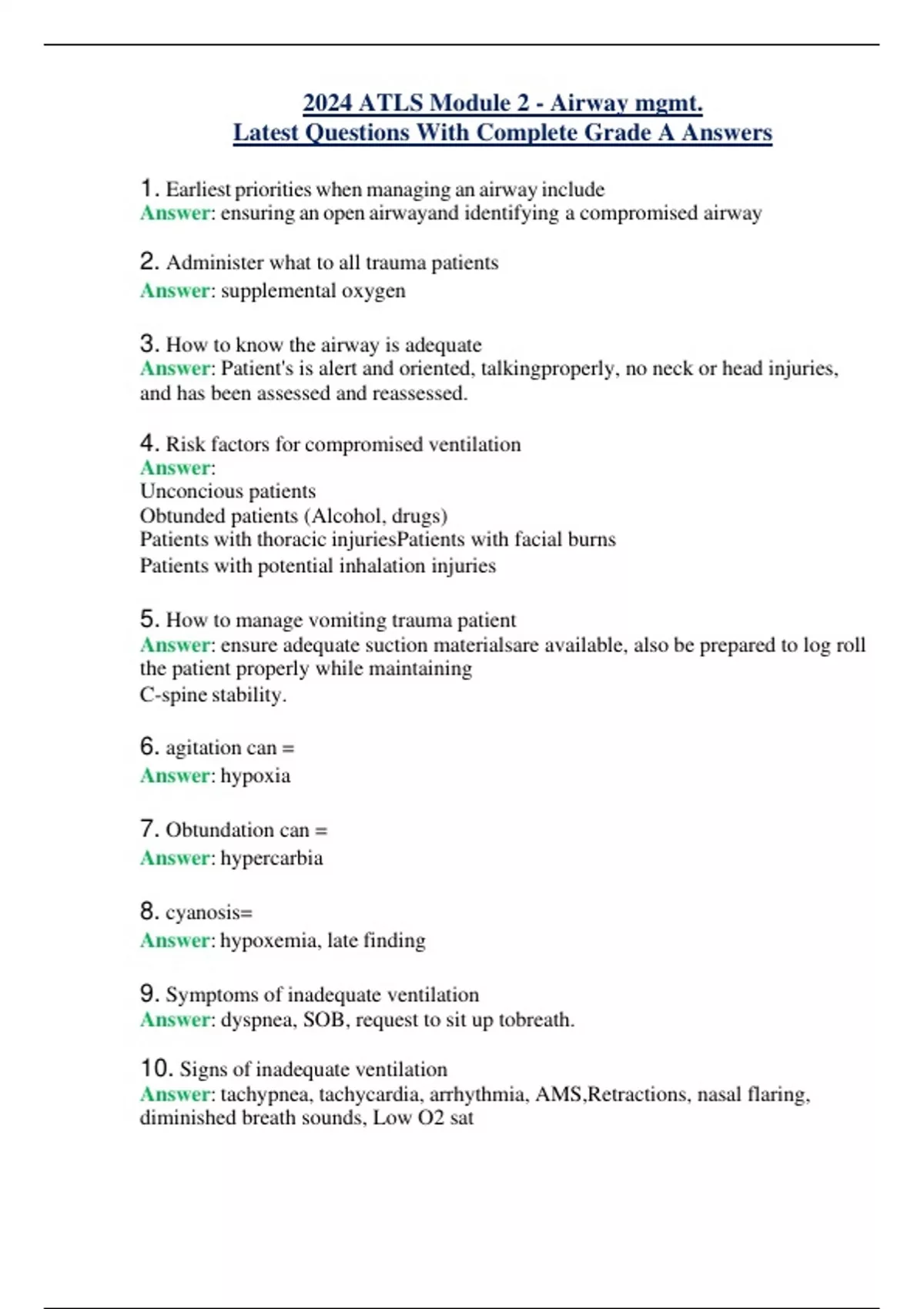 2024 ATLS Module 2 - Airway mgmt. Latest Questions With Complete Grade A Answers 1. Earliest priorities when managing an airway include Answer: ensuring an open airwayand identifying a compromised airway 2. Administer what to all trauma patients Answer: supplemental oxygen 3. How to know the airway is adequate Answer: Patient's is alert and oriented, talkingproperly, no neck or head injuries, and has been assessed and reassessed. 4. Risk factors for compromised ventilation Answer: Unconcious patients Obtunded patients (Alcohol, drugs) Patients with thoracic injuriesPatients with facial burns Patients with potential inhalation injuries 5. How to manage vomiting trauma patient Answer: ensure adequate suction materialsare available, also be prepared to log roll the patient properly while maintaining C-spine stability. 6. agitation can = Answer: hypoxia 7. Obtundation can = Answer: hypercarbia 8. cyanosis= Answer: hypoxemia, late finding 9. Symptoms of inadequate ventilation Answer: dyspnea, SOB, request to sit up tobreath. 10. Signs of inadequate ventilation Answer: tachypnea, tachycardia, arrhythmia, AMS,Retractions, nasal flaring, diminished breath sounds, Low O2 sat