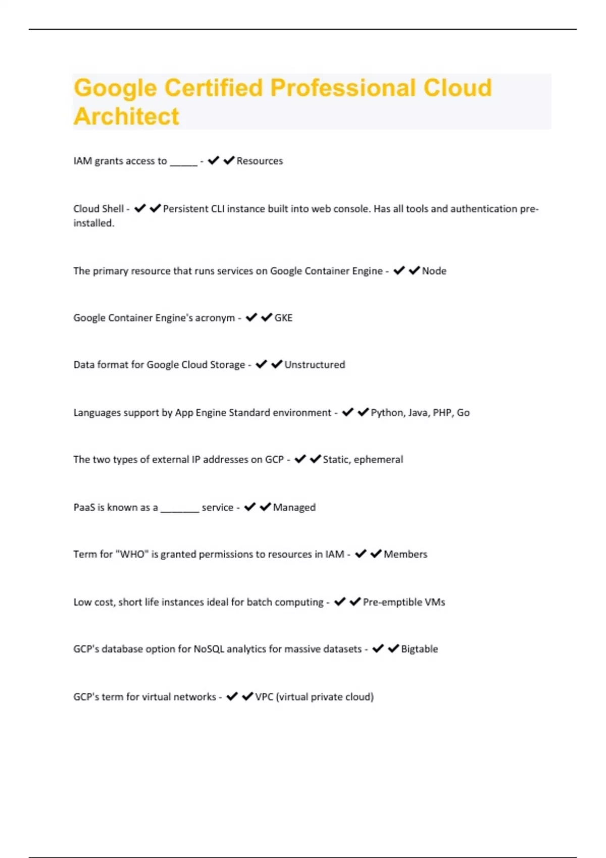 IAM grants access to _____ - Resources Cloud Shell - Persistent CLI instance built into web console. Has all tools and authentication preinstalled. The primary resource that runs services on Google Container Engine - Node Google Container Engine's acronym - GKE Data format for Google Cloud Storage - Unstructured Languages support by App Engine Standard environment - Python, Java, PHP, Go The two types of external IP addresses on GCP - Static, ephemeral PaaS is known as a _______ service - Managed Term for "WHO" is granted permissions to resources in IAM - Members Low cost, short life instances ideal for batch computing - Pre-emptible VMs GCP's database option for NoSQL analytics for massive datasets - Bigtable GCP's term for virtual networks - VPC (virtual private cloud)The faster scaling of the two App Engine environments - Standard (seconds vs. minutes)