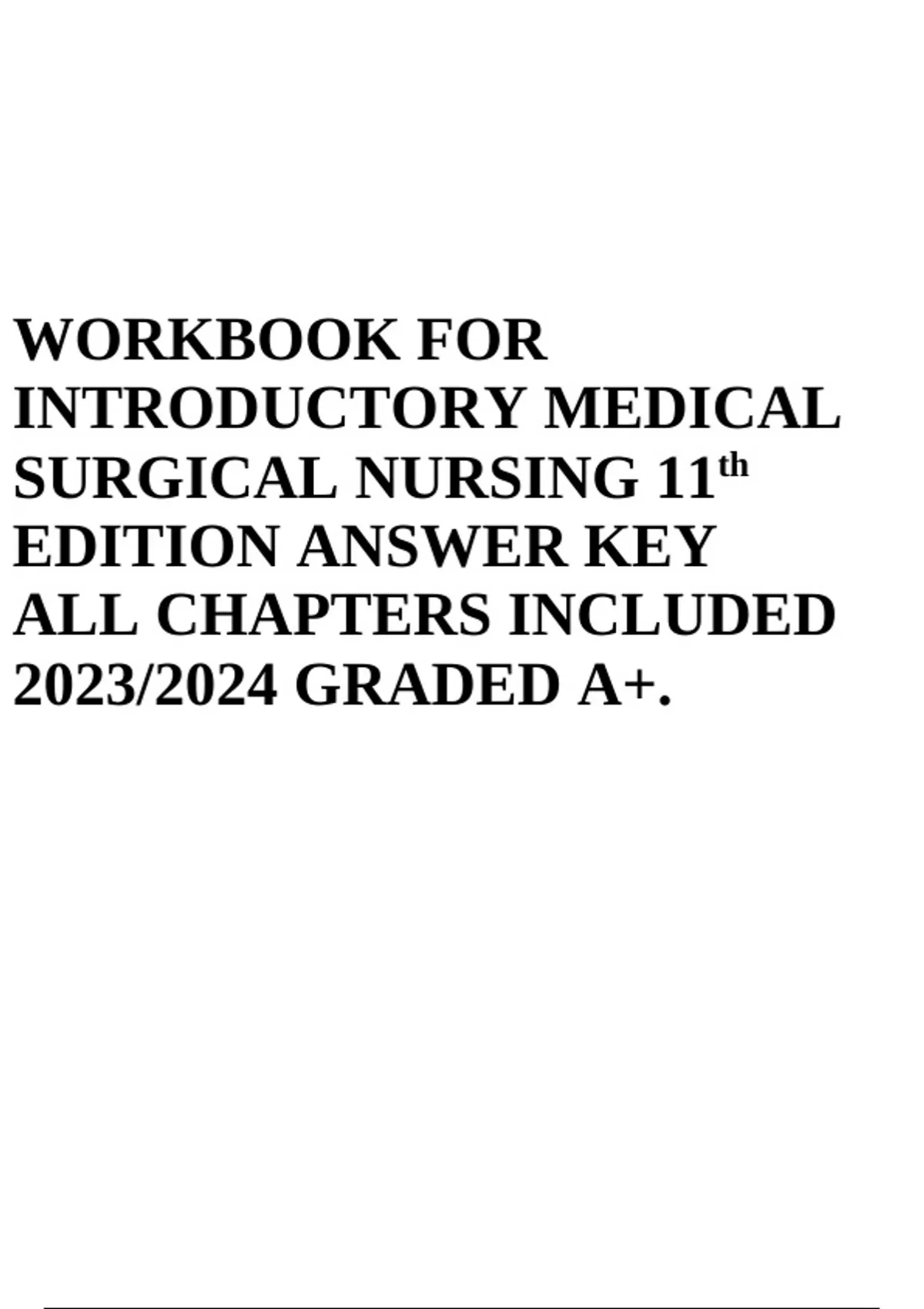 WORKBOOK FOR INTRODUCTORY MEDICAL SURGICAL NURSING 11th EDITION ANSWER KEY ALL CHAPTERS INCLUDED 2023/2024 GRADED A+. Answer Key for Workbook for Introductory Medical-Surgical Nursing, 11e Chapter 1 SECTION 1: ASSESSING YOUR UNDERSTANDING Activity A 1. Illness 2. Client 3. Healthcare delivery system 4. Health 5. Medicaid Activity B 1. Holism 2. Healthcare team 3. Medicare 4. Diagnosis-related groups 5. Wellness Activity C 1. C 2. D 3. E 4. A 5. B Activity D 1. The major difference between illness and disease is that illness is highly individual and personal, whereas disease is something more definitive and measurable. For example, a client with arthritis presents with distinct pathologic changes associated with the disease. A person, however, may or may not be ill with arthritis. The degree of pain, suffering, and immobility varies from person to person. 2. Health maintenance refers to protecting one’s current level of health by preventing illness or deterioration, such as by complying with medication regimens, being screened for diseases such as breast cancer or colon cancer, or practicing safe sex. Health promotion refers to engaging in strategies to enhance health such as eating a diet high in grains and complex carbohydrates, exercising regularly, balancing work with leisure activities, and practicing stress-reduction techniques. 3. Medicare covers individuals who are 65 years or older, permanently disabled workers of any age with specific disabilities, and persons with end-stage renal disease. 4. The team includes physicians, nurses, psychologists, pharmacists, dietitians, social workers, respiratory and physical therapists, occupational therapists, nursing assistants, technicians, and insurance company staff. All members of this team collaborate on client issues (medical, social, and financial) to achieve the best possible outcomes. 5. Groups such as children, older adults, ethnic minorities, and the poor are most likely to be underserved by the healthcare system. Activity E 1. Point-of-service (POS) organizations involve a network of providers. Clients select a primary care physician within the group who then serves as the gatekeeper for other healthcare services. Clients can use healthcare providers in or out of the provider group, but may pay additional fees, such as a higher deductible or copayment, for providers outside the group, unless the primary physician approves. 2. Clients select a primary care physician within the group who then serves as the gatekeeper for other healthcare services. As with other types of managed care organizations, the focus is on prevention as the best way to manage healthcare costs. 3. Benefits for the insurer include discounted services, reduced services, and elimination of unnecessary referrals (Chitty & Black, 2011). 4. All are types of managed care networks. They provide a number of services within the network at a controlled cost. All provide incentive to stay within the network by providing lower cost services. Seeking services outside each of the organizations would incur higher costs for the client with the exception of the point-of service (POS) plan, which allows it if approved by the primary care physician who serves as the gatekeeper. The goal of all the organizations (POS, PPO, and PHO) is to maintain high-quality service and contain costs. SECTION 2: APPLYING YOUR KNOWLEDGE Activity F 1. Members of an HMO must receive authorization (referral) for secondary care, such as second opinions from specialists or diagnostic testing. If members obtain unauthorized care, they are responsible for the entire bill. In this way, HMOs serve as gatekeepers for healthcare services. 2. Some individuals delay seeking early treatment for their health problems because they cannot afford to pay for services. When an illness becomes so severe that the only choice is to seek medical attention, many turn to their local hospital emergency departments for primary care. This expensive alternative usually involves long waits and no follow-up care. 3. Possible premature discharge of clients and increased responsibility for family members who may be unable to provide adequate care creates much criticism of the prospective payment system. These systems have also caused shifts in costs from clients with Medicare to those who have private insurance. Providers charge privately insured clients inflated amounts to make up for losses in Medicare revenues. Activity G 1. Demand for evidence that hospitals and practitioners provide high-quality, cost-effective care comes from insurers, regulatory bodies such as The Joint Commission, and consumers. One example of standardized indicators are the quality indicators (QIs) provided by the Agency for Healthcare Research and Quality (AHRQ). These QIs can be used to measure healthcare quality at the federal, state, and local levels. The Joint Commission has also established National Patient Safety Goals (NPSGs), which are updated annually. Multidisciplinary teams use clinical pathways or care mapping for specific diagnoses or procedures, which standardize important aspects of care. Many other methods exist for determining quality of care. Patient satisfaction surveys, quality-of-life questionnaires, functional assessment tools, number of hospital admissions per year for clients with chronic illnesses, and morbidity (complications) and mortality (deaths) rates are a few important measures assessed when examining quality. 2. Managed care involves insurers who carefully plan and closely supervise the distribution of healthcare services. The goals of managed care include the following: (i) Use healthcare resources efficiently. (ii) Deliver high-quality care at a reasonable cost. (iii) Measure, monitor, and manage fiscal and client outcomes. (iv) Prevent illness through screening and health promotion activities. (v) Provide client education to decrease the risk of the disease. (vi) Case-manage clients with chronic illnesses to minimize