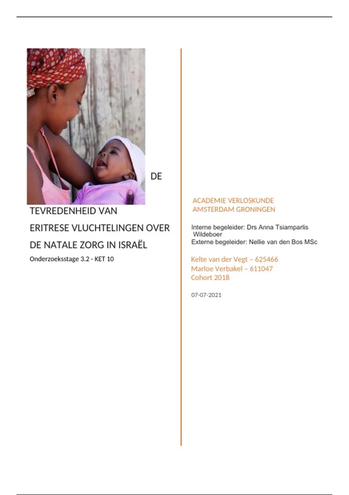 Kwantitatieve scriptie voor de studie Verloskunde - In de huidige studie wordt onderzoek gedaan naar de mate van tevredenheid van Eritrese vluchtelingen met de Israëlische natale zorg en of deze tevredenheid wordt beïnvloed door de pariteit, het ervaren van racisme en de wijze van bevallen. De hoofdvraag voor de huidige studie luidt: Wat is het verband tussen de pariteit van Eritrese vluchtelingen en de mate van tevredenheid met de ontvangen Israëlische natale zorg?