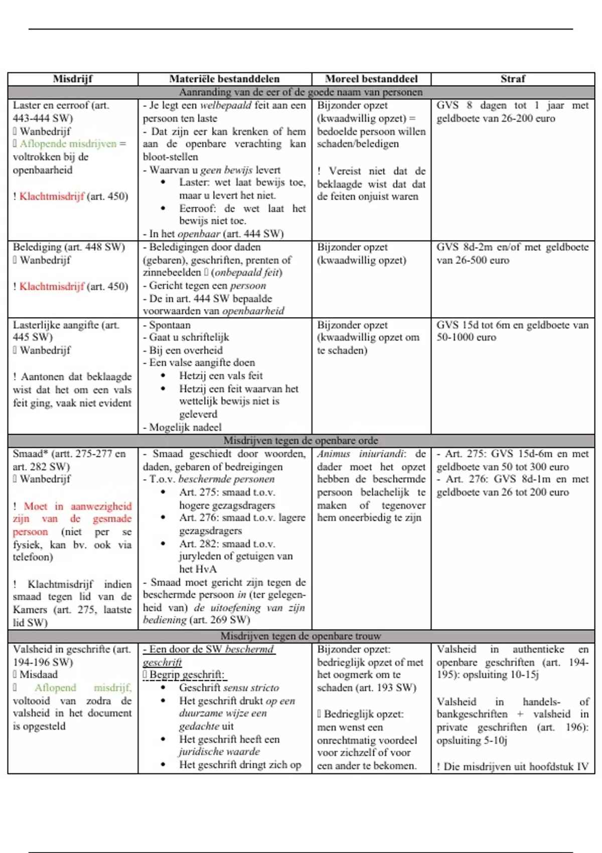 Dit is een beknopte samenvatting van de misdrijven die besproken werden in het vak 'bijzonder strafrecht'. Bij elk misdrijf worden zowel de materiële als de morele bestanddelen opgesomd met bijkomende weetjes die van belang zijn bij elke specifiek misdrijf.