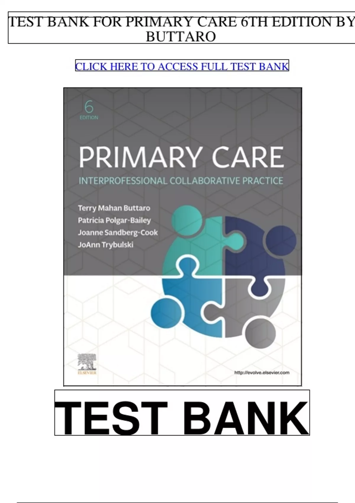 Chapter 03: Empowering Patients as Collaborative partners: A New Model for Primary Care Buttaro: Primary Care: A Collaborative Practice, 6th Edition MULTIPLE CHOICE 1. Which statement made by a health care provider demonstrates the most appropriate understanding for the goal of a performance report? a. “This process allows me to critique the performance of the rest of the staff.” b. “Most organizations require staff to undergo a performance evaluation yearly.” c. “It is hard to be personally criticized but that’s how we learn to change.” d. “The comments should help me improve my management skills.” ANS: D The goal of the performance report is to provide guidance to staff in the areas of professional development, mentoring, and leadership development. A peer review is written by others who perform similar skills (peers). The remaining options may be true but do not provide evidence of understanding of the goal of this professional requirement. MULTIPLE RESPONSE 1. Which assessment question would a health care provider ask when engaging in the previsit stage of the new model for primary care? ( Select all that apply .) a. “Are you ready to discuss some of the community resources that are available?” b. “Are you experi encing any side effects from your newly prescribed medications?” c. “Do you anticipate any problems with adhering to your treatment plan?” d. “Are you ready to discuss the results of your laboratory tests?” e. “Do you ha ve any questions about the lab tests that have been ordered for you?” ANS: B, C, E The nursing responsibilities in the previsit stage include assessing the patient’s tolerance of prescribed medications, understanding of existing treatment plan, and educ ation about required lab testing. The primary care provider is responsible for screening lab data and discussing community resources during the actual visit. TEST BANK FOR PRIMARY CARE 6TH EDITION BY BUTTARO