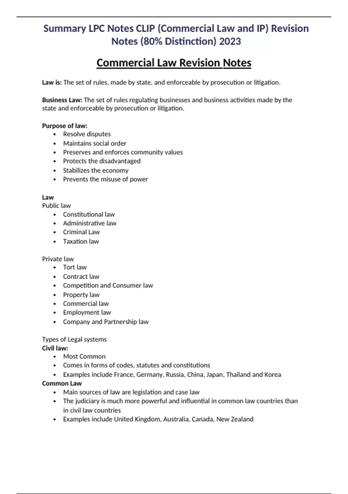 Summary LPC Notes CLIP (Commercial Law and IP) Revision Notes (80% Distinction) 2023 Commercial Law Revision Notes Law is: The set of rules, made by state, and enforceable by prosecution or litigation. Business Law: The set of rules regulating businesses and business activities made by the state and enforceable by prosecution or litigation. Purpose of law: • Resolve disputes • Maintains social order • Preserves and enforces community values • Protects the disadvantaged • Stabilizes the economy • Prevents the misuse of power Law Public law • Constitutional law • Administrative law • Criminal Law • Taxation law Private law • Tort law • Contract law • Competition and Consumer law • Property law • Commercial law • Employment law • Company and Partnership law