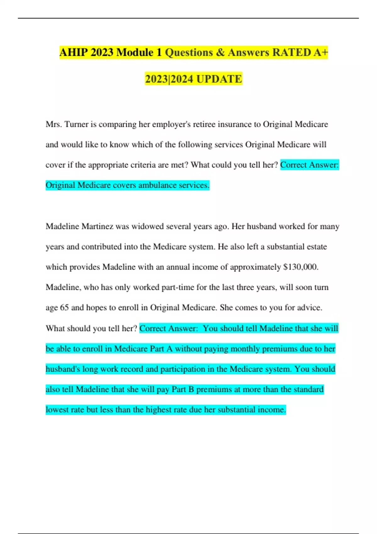 AHIP 2023 Module 1 Questions & Answers RATED A+ 2023|2024 UPDATE Mrs. Turner is comparing her employer's retiree insurance to Original Medicare and would like to know which of the following services Original Medicare will cover if the appropriate criteria are met? What could you tell her? Correct Answer: Original Medicare covers ambulance services. Madeline Martinez was widowed several years ago. Her husband worked for many years and contributed into the Medicare system. He also left a substantial estate which provides Madeline with an annual income of approximately $130,000. Madeline, who has only worked part-time for the last three years, will soon turn age 65 and hopes to enroll in Original Medicare. She comes to you for advice. What should you tell her? Correct Answer: You should tell Madeline that she will be able to enroll in Medicare Part A without paying monthly premiums due to her husband's long work record and participation in the Medicare system. You should also tell Madeline that she will pay Part B premiums at more than the standard lowest rate but less than the highest rate due her substantial income. Mr. Rainey is experiencing paranoid delusions and his physician feels that he should be hospitalized. What should you tell Mr. Rainey (or his representative) about the length of an inpatient psychiatric hospital stay that Medicare will cover? Correct Answer: Medicare will cover a total of 190 days of inpatient psychiatric care during Mr. Rainey's entire lifetime. Mrs. Shields is covered by Original Medicare. She sustained a hip fracture and is being successfully treated for that condition. However, she and her physicians feel that after her lengthy hospital stay she will need a month or two of nursing and rehabilitative care. What should you tell them about Original Medicare's coverage of care in a skilled nursing facility? Correct Answer: Medicare will cover Mrs. Shield's skilled nursing services provided during the first 20 days of her stay, after which she would have a copay until she