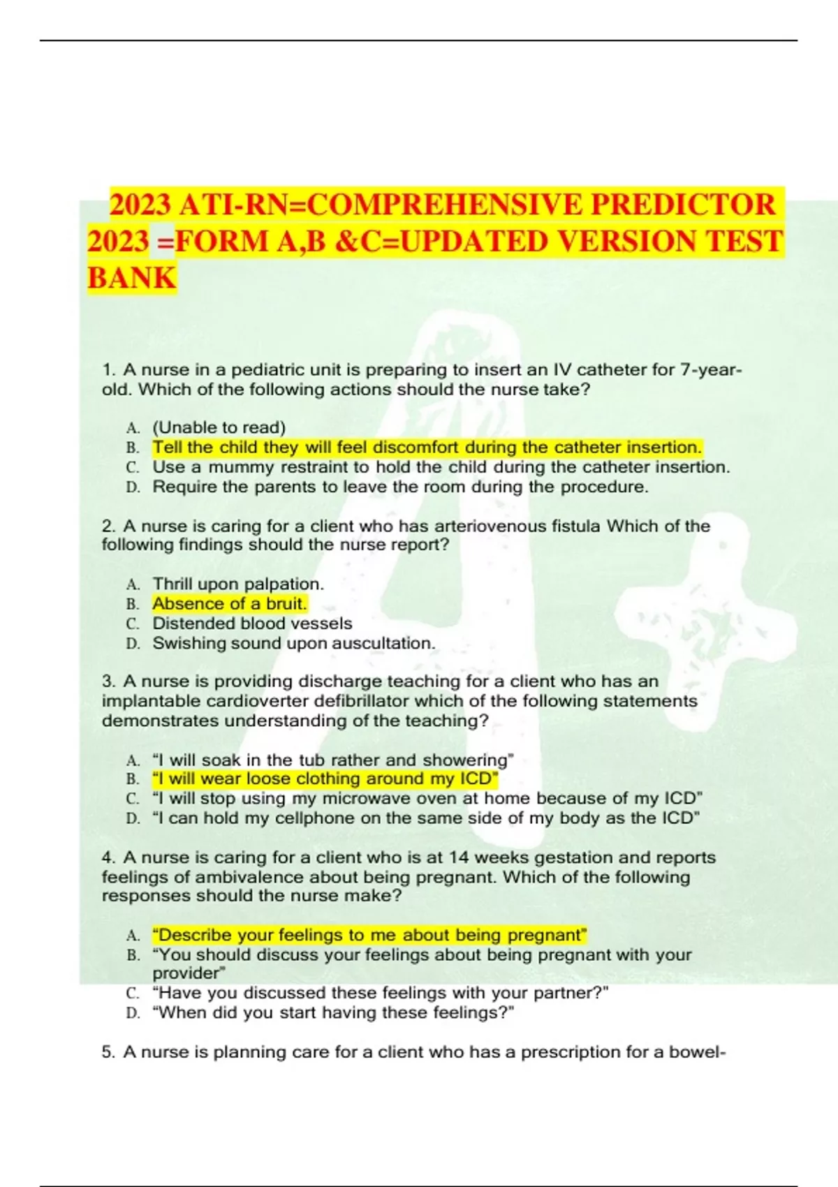 2023 ATI-RN=COMPREHENSIVE PREDICTOR 2023 =FORM A,B &C=UPDATED VERSION TEST BANK 1. A nurse in a pediatric unit is preparing to insert an IV catheter for 7-yearold. Which of the following actions should the nurse take? A. (Unable to read) B. Tell the child they will feel discomfort during the catheter insertion. C. Use a mummy restraint to hold the child during the catheter insertion. D. Require the parents to leave the room during the procedure. 2. A nurse is caring for a client who has arteriovenous fistula Which of the following findings should the nurse report? A. Thrill upon palpation. B. Absence of a bruit. C. Distended blood vessels D. Swishing sound upon auscultation. 3. A nurse is providing discharge teaching for a client who has an implantable cardioverter defibrillator which of the following statements demonstrates understanding of the teaching? A. “I will soak in the tub rather and showering” B. “I will wear loose clothing around my ICD” C. “I will stop using my microwave oven at home because of my ICD” D. “I can hold my cellphone on the same side of my body as the ICD” 4. A nurse is caring for a client who is at 14 weeks gestation and reports feelings of ambivalence about being pregnant. Which of the following responses should the nurse make? A. “Describe your feelings to me about being pregnant” B. “You should discuss your feelings about being pregnant with your provider” C. “Have you discussed these feelings with your partner?” D. “When did you start having these feelings?”