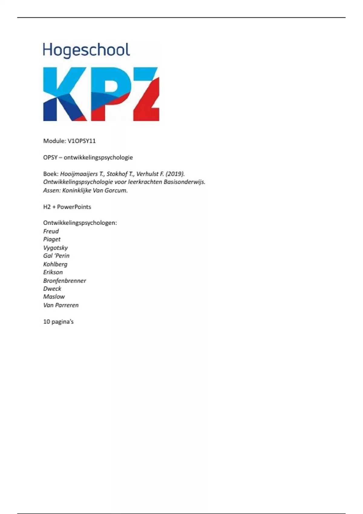 Het is een samenvatting van hoofdstuk 2 uit het boek Ontwikkelingspsychologie voor leerkrachten basisonderwijs en de powerpoints van de lessen. Er worden 10 ontwikkelingspsychologen samengevat: Freud, Piaget, Erikson, Bronfenbrenner, Maslow, Kohlberg, Vygotsky, Gal 'Perin, Van Parreren en Dweck. In de samenvatting worden drie kleuren gebruikt. Rood staat voor de hoofdstukken. Blauw staat voor het een paar keer doorlezen. Zwart staat voor het in je hoofd stampen.