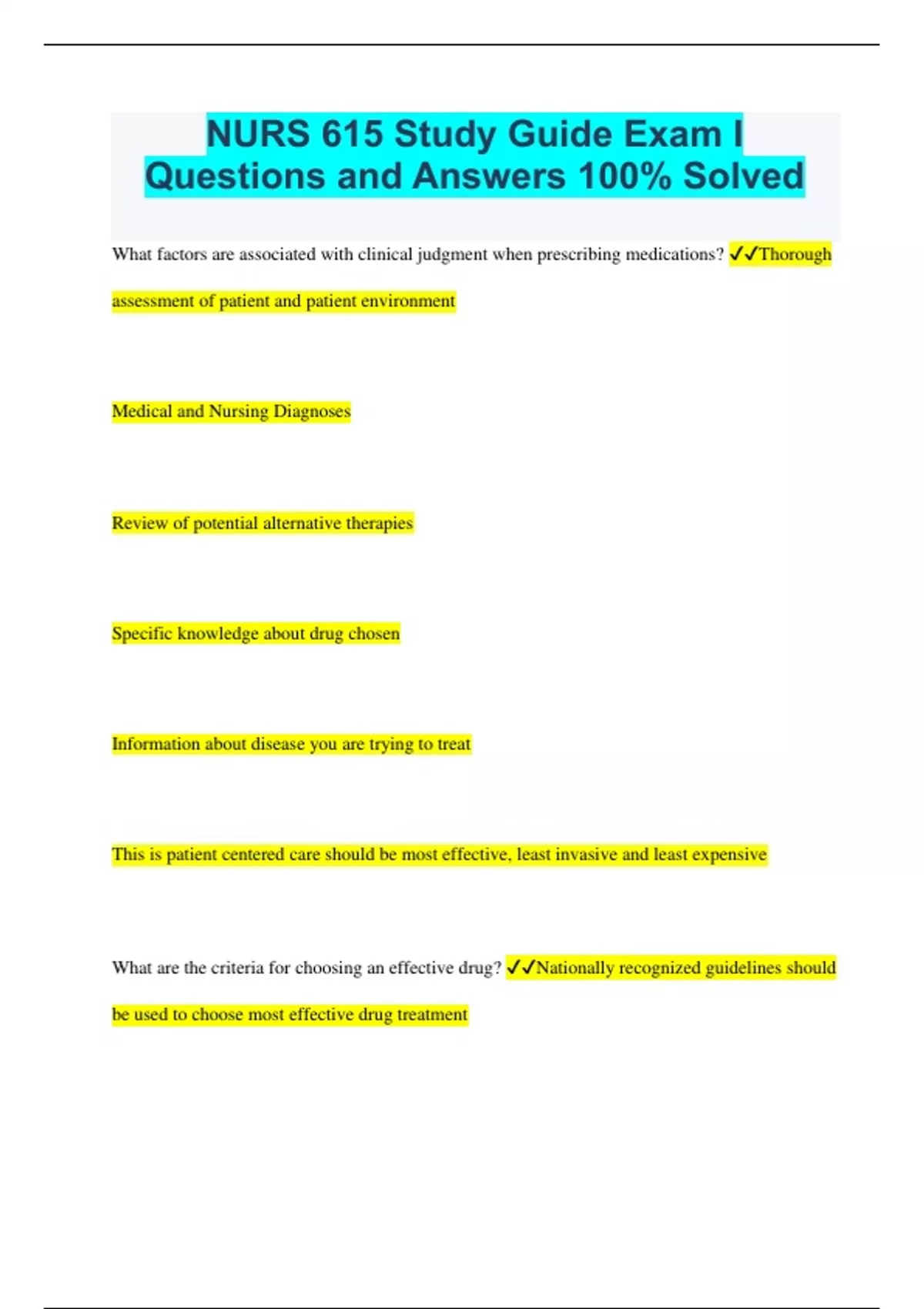 NURS 615 Study Guide Exam I Questions and Answers 100% Solved What factors are associated with clinical judgment when prescribing medications? Thorough assessment of patient and patient environment Medical and Nursing Diagnoses Review of potential alternative therapies Specific knowledge about drug chosen Information about disease you are trying to treat This is patient centered care should be most effective, least invasive and least expensive What are the criteria for choosing an effective drug? Nationally recognized guidelines should be used to choose most effective drug treatment JNC7 for hypertension Recommendations for SPE prophylaxis for endocarditis put out by American Cardiac Physicians and AHA How does hypoalbuminemia affect the process of prescribing? Many drugs that carry an electric charge bind with albumin in the blood The distribution of drug to the targeted tissues may be affected if hypoalbuminemia is present What is the drug's half-life? The amount of time for an administered to be half-way cleared from the body Takes 4-5x half life for drug serum to reach steady state after regular dosing is started, stopped, or the dose is changed Digoxin half life 24-36 hours change in dose will take a week for full effect Drugs with long half life like amiodarone 58day half life are usually started with a loading dose to achieve steady state more quickly. Must use half life to determine the length of time required between dosage administrations. What is meant by the onset of action, peak of action, duration of action of medications? Onset: Time between administration and minimum concentration of a drug to produce an effect. First sign of drugs therapeutic effect. Peak: Time between drug administration and maximum concentration of blood in the blood stream Duration: Time between onset of action and the metabolism of drug below minimum needed for effect Explain first pass metabolism. Also called pre-systemic metabolism. Concentration of drug is greatly reduced before systemic circulation Fraction of drug lost in absorption Occurs in liver and gut wall Significant first pass effect drugs: morphine, propanolol, diazepam, demoral, lidocaine, midazolam After a drug is swallowed absorbed by digestive system to the hepatic portal system, then carried through to portal vein to liver then sent to the rest of the body Liver reduces bioavailability Sublingual administration bypasses the first pass effect. Faster than oral and rectal admin What is a steady state? Intake of drug = to elimination Therapeutic level 4 to 5 times half life must occur before steady state is achieved What factors affect the drug's absorption? Introduced via administration (oral, topical, transdermal) in its dosage form Absorption more straight forward in IV, enteral, IM and bioavailability is greater near 100% IV administration does not involve absorption and bioavailability is 100% Fastest route of absorption is INHALATION (not IV) GI tract lined with epithelial cell must permeate these to get to circulatory system. Cell membrane (lipid bilayer) that may inhibit SEMIPERMIABLE. Only permeable to small uncharged solutes. Ionic molecules are charged. Solubility=charged species Permeability=neutral species Henderson Hasselback equation offers a way to determine the proportion of a substance that is ionized in the given pH. In the stomach drugs with weak acids such as aspirin will be present in the non-ionic form and weak bases will be in ionic form. Weak acids have higher absorption in highly acidic stomach. Basic environment in intestines, reverse occurs with caffeine Identify drug metabolism and the role of the isoenzymes of the P450 system. CYPs are the major enzyme involved in drug metabolism account for 75% of total metabolism Most drugs deactivated are directly affected or facilitated by CYP excretion from the body Many substances bioactivated by CYPs to form active compounds Many drugs increase or decrease the activity of various isoactive enzymes by inducing biosynthesis of the isozyme (enzyme induction) or by directly inhibiting the activity of CYP (enzyme inhibition) MAJOR SOURCE OF ADVERSE DRUG REACTIONS changes in CYP activity affect metabolism and clearance of various drugs Interactions between two meds can lead to toxicity prescribers may need to adjust dosages or choose drugs that do not interact IMPORTANT IN DRUGS w/ SMALL THERAPEUTIC WINDOWS Example: Antiepiletic drugs & Amiodarone, Grapefruit juice & medications leading to increase bioavailability and overdose What is the efficacy of the drug? Maximum response achievable from a drug Intrinsic activity Effectiveness--ability to produce beneficial effect On the drug concentration curve what is the first sign of a therapeutic effect? The onset of action What is the purpose of a peak and trough level? To determine if drug is in therapeutic range refers to dosage range or serum concentration. Some patients require more or less than this range. Some may experience toxicity within this range Describe the purpose of the blood brain barrier and the fetal placental barrier. BBB: Highly selective permeable membrane that protects the CNS connected by tight junctions brain and ethelial cells Allows the passage of water, some gases, lipid soluble fluids with passive diffusion Glucose and amino acids are allowed to cross FPB: Impedes certain chemicals most fat soluble chemicals can cross More water soluble drugs and higher molecular weight CANNOT cross. If drug binds to large molecule such as albumin it will not cross How will renal insufficiency affect drug elimination? Kidney primary organ of excretion Rate depends on renal blood flow GFR (glomerular filtration rate) renal function tested by creatinine According to the WHO, what is the first step in the prescribing process? Define patient's problem to determine a clear indication for treatment Consider other medications, allergies, pregnancy, comorbidities Summary of diagnostic part of consultation SECOND STEP: Therap