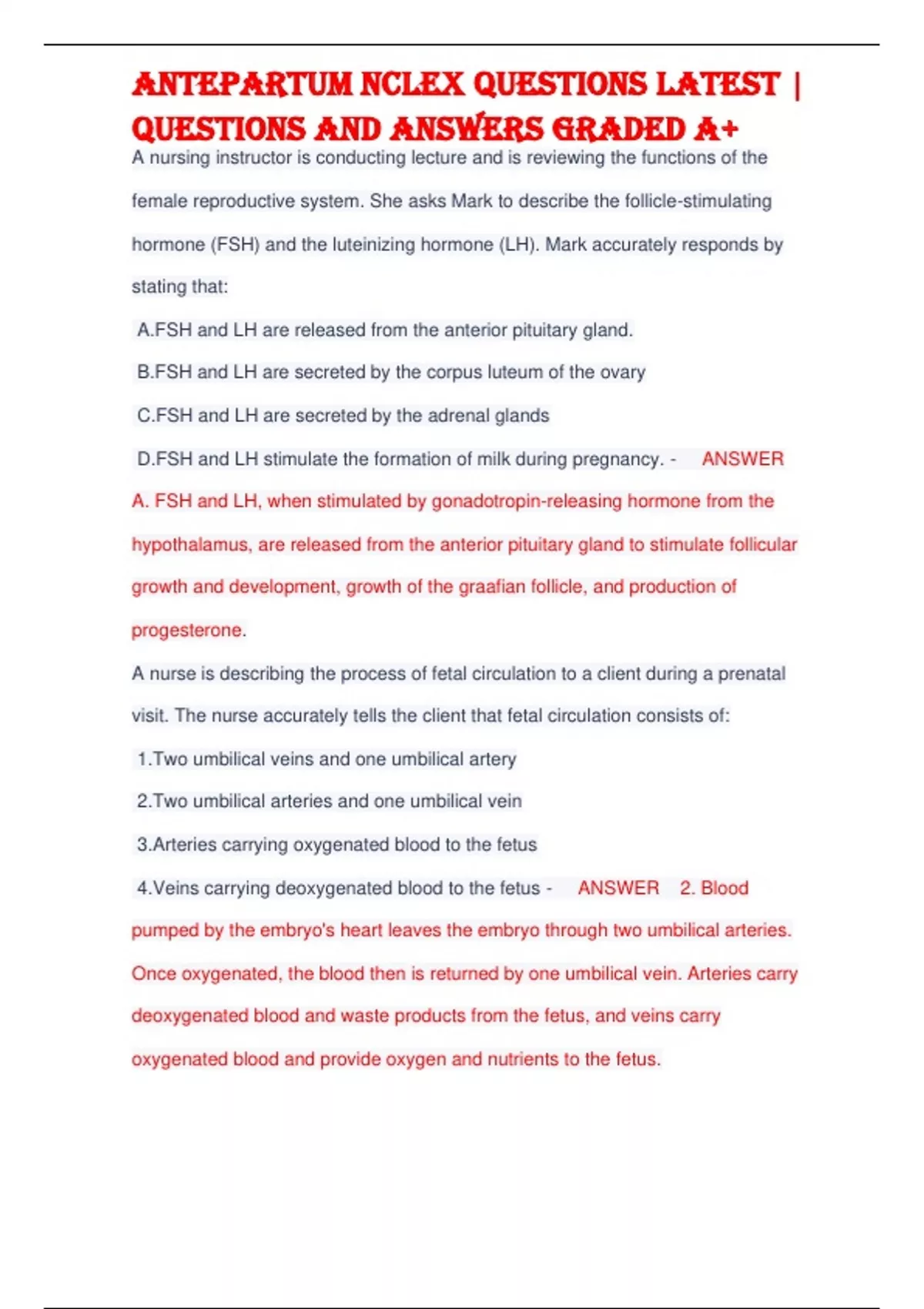 A nursing instructor is conducting lecture and is reviewing the functions of the female reproductive system. She asks Mark to describe the follicle-stimulating hormone (FSH) and the luteinizing hormone (LH). Mark accurately responds by stating that: A.FSH and LH are released from the anterior pituitary gland. B.FSH and LH are secreted by the corpus luteum of the ovary C.FSH and LH are secreted by the adrenal glands D.FSH and LH stimulate the formation of milk during pregnancy. - ANSWER A. FSH and LH, when stimulated by gonadotropin-releasing hormone from the hypothalamus, are released from the anterior pituitary gland to stimulate follicular growth and development, growth of the graafian follicle, and production of progesterone. A nurse is describing the process of fetal circulation to a client during a prenatal visit. The nurse accurately tells the client that fetal circulation consists of: 1.Two umbilical veins and one umbilical artery 2.Two umbilical arteries and one umbilical vein 3.Arteries carrying oxygenated blood to the fetus 4.Veins carrying deoxygenated blood to the fetus - ANSWER 2. Blood pumped by the embryo's heart leaves the embryo through two umbilical arteries. Once oxygenated, the blood then is returned by one umbilical vein. Arteries carry deoxygenated blood and waste products from the fetus, and veins carry oxygenated blood and provide oxygen and nutrients to the fetus. AntepArtum nCLeX questions LAtest | questions And Answers grAded A+ During a prenatal visit at 38 weeks, a nurse assesses the fetal heart rate. The nurse determines that the fetal heart rate is normal if which of the following is noted? 1.80 BPM 2.100 BPM 3.150 BPM 4.180 BPM - ANSWER .3. The fetal heart rate depends in gestational age and ranges from 160-170 BPM in the first trimester but slows with fetal growth to 120- 160 BPM near or at term. At or near term, if the fetal heart rate is less than 120 or more than 160 BPM with the uterus at rest, the fetus may be in distress. A client arrives at a prenatal clinic for the first prenatal assessment. The client tells a nurse that the first day of her last menstrual period was September 19th, 2005. Using Nagele's rule, the nurse determines the estimated date of confinement as: 1.July 26, 2006 2.June 12, 2007 3.June 26, 2006 4.July 12, 2007 - ANSWER 3. Accurate use of Nagele's rule requires that the woman have a regular 28-day menstrual cycle. Add 7 days to the first day of the last menstrual period, subtract three months, and then add one year to that date. A nurse is collecting data during an admission assessment of a client who is pregnant with twins. The client has a health
