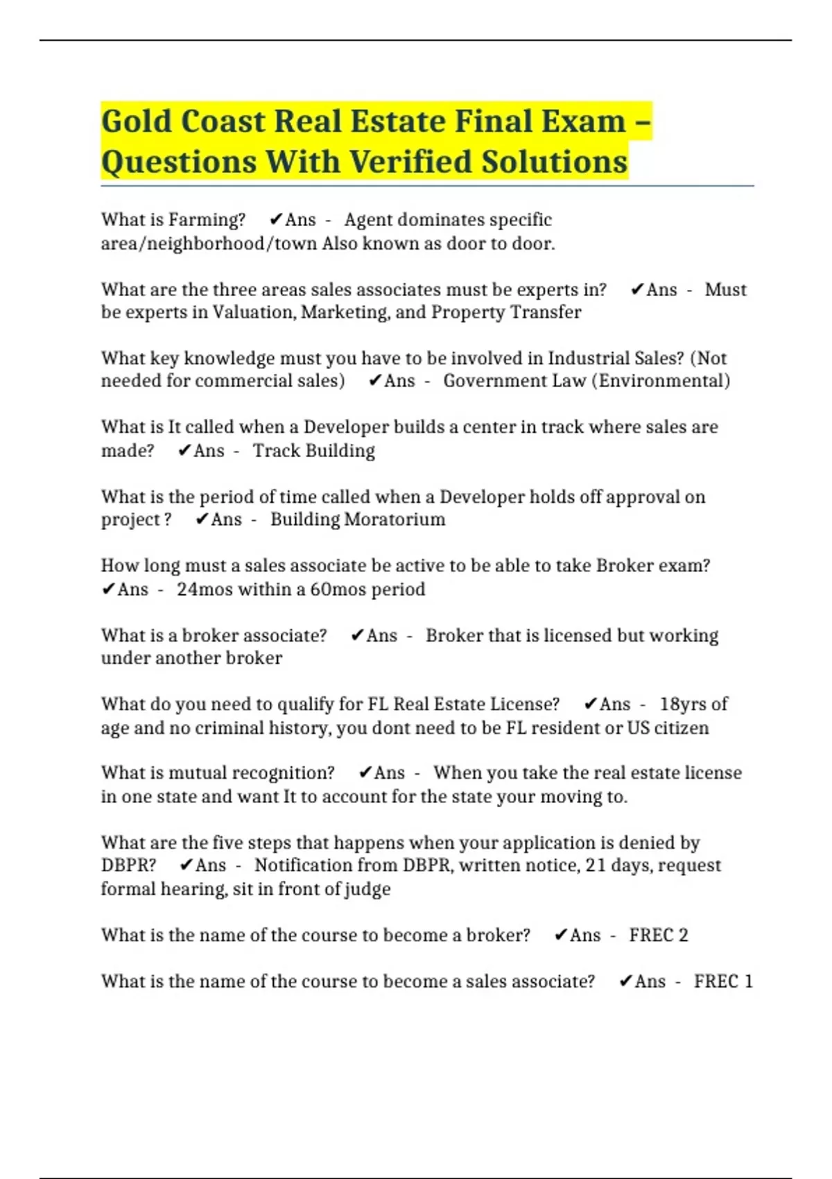 Gold Coast Real Estate Final Exam – Questions With Verified Solutions