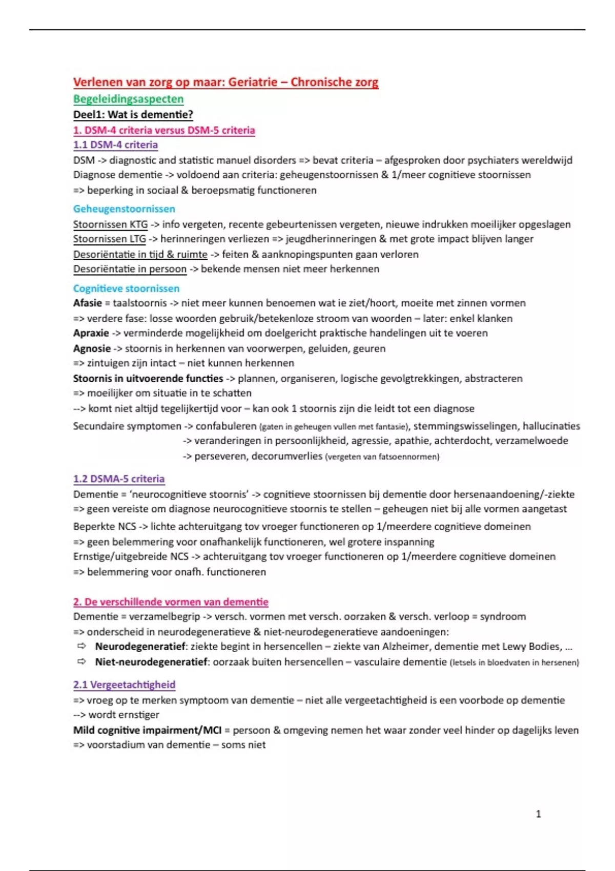 Diagnose dementie -> voldoend aan criteria: geheugenstoornissen & 1/meer cognitieve stoornissen