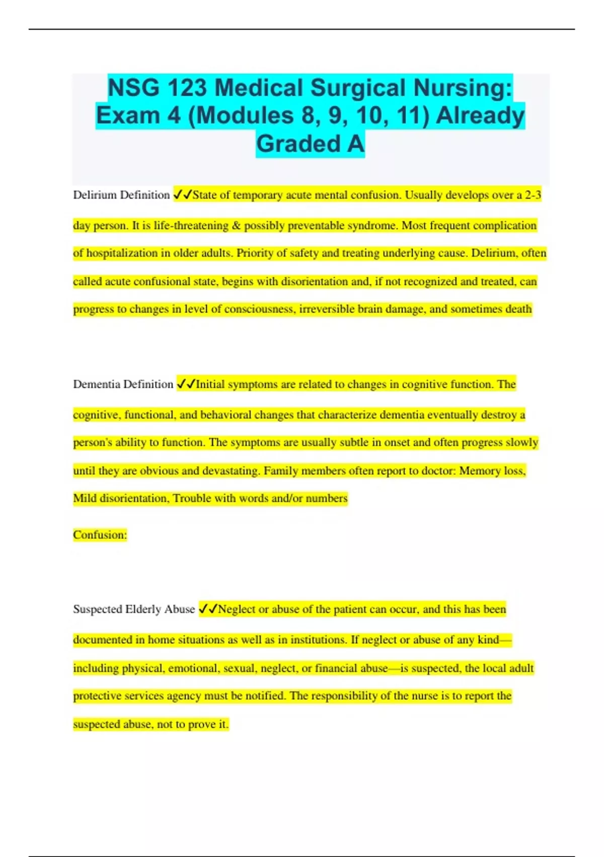 NSG 123 Medical Surgical Nursing: Exam 4 (Modules 8, 9, 10, 11) Already Graded A Delirium Definition State of temporary acute mental confusion. Usually develops over a 2-3 day person. It is life-threatening & possibly preventable syndrome. Most frequent complication of hospitalization in older adults. Priority of safety and treating underlying cause. Delirium, often called acute confusional state, begins with disorientation and, if not recognized and treated, can progress to changes in level of consciousness, irreversible brain damage, and sometimes death Dementia Definition Initial symptoms are related to changes in cognitive function. The cognitive, functional, and behavioral changes that characterize dementia eventually destroy a person's ability to function. The symptoms are usually subtle in onset and often progress slowly until they are obvious and devastating. Family members often report to doctor: Memory loss, Mild disorientation, Trouble with words and/or numbers Confusion: Suspected Elderly Abuse Neglect or abuse of the patient can occur, and this has been documented in home situations as well as in institutions. If neglect or abuse of any kind—including physical, emotional, sexual, neglect, or financial abuse—is suspected, the local adult protective services agency must be notified. The responsibility of the nurse is to report the suspected abuse, not to prove it. What is the point of medications in Alzheimer's? Slow the Progression What two categories of medications are used to treat Alzheimer's? Acetylcholinesterase inhibitor & N-methyl-D-aspartate receptor antagonist N-methyl-D-aspartate receptor antagonist: Name? What Disease? What to watch for? What does it do? Alzheimer's Memantine- Namenda Decreases glutamate circulation in the brain • Watch renal disease Acetylcholinesterase Inhibitor: Name? What Disease? What to watch for? What does it do? Alzheimer's Increases uptake of acetylcholine (Donepezil- Aricept, Rivastigmine- Exelon) • Watch liver disease Cardinal Signs of Parkinson's Symptoms: Tremor, Rigidity, Bradykinesoa (overall slowing of active movement), Postural Instability (postural and gait problems), Gradual onset, symptoms progress slowly over a chronic, prolonged course Diagnosis of Parkinsons: Although laboratory tests and imaging studies are not helpful to the clinician in diagnosing PD ongoing research with PET and single-photon emission computed tomography scanning has been helpful in understanding the disease and advancing treatment. Currently, the disease is diagnosed clinically from the patient's history and the presence of two of the four cardinal manifestations: tremor, rigidity, bradykinesia, and postural changes. CT scan can show some chronic changes but will not change long term outcomes. The medical history, presenting symptoms, neurologic examination, and response to pharmacologic management are carefully evaluated when making the diagnosis. Confirmation Diagnosis of Parkinson's Give patient Levodopa-Carbodopa and see if they respond to it or not. What does Levodopa do? & What disease is it used in? Increases dopamine available in the brain Parkinson's What does adding Carbidopa to Levodopa do? What disease is it used in? Adding Carbidopa can slow how quickly Levodopa is absorbed Parkinson's What is the brand name of Carbidopa/Levodopa? Simemet Why would a provider add Entacapone (Comtan) to a Sinemet medication regimen? Works well in combo with Simemet What does Amatnadine (Symmetrel) do? increases dopamine release in the nigrostriatal pathway 2