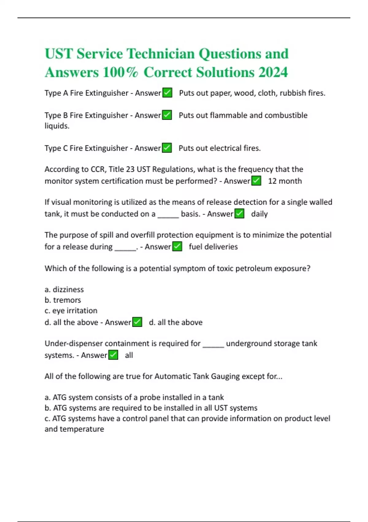 UST Service Technician Questions and Answers 100% Correct Solutions 2024