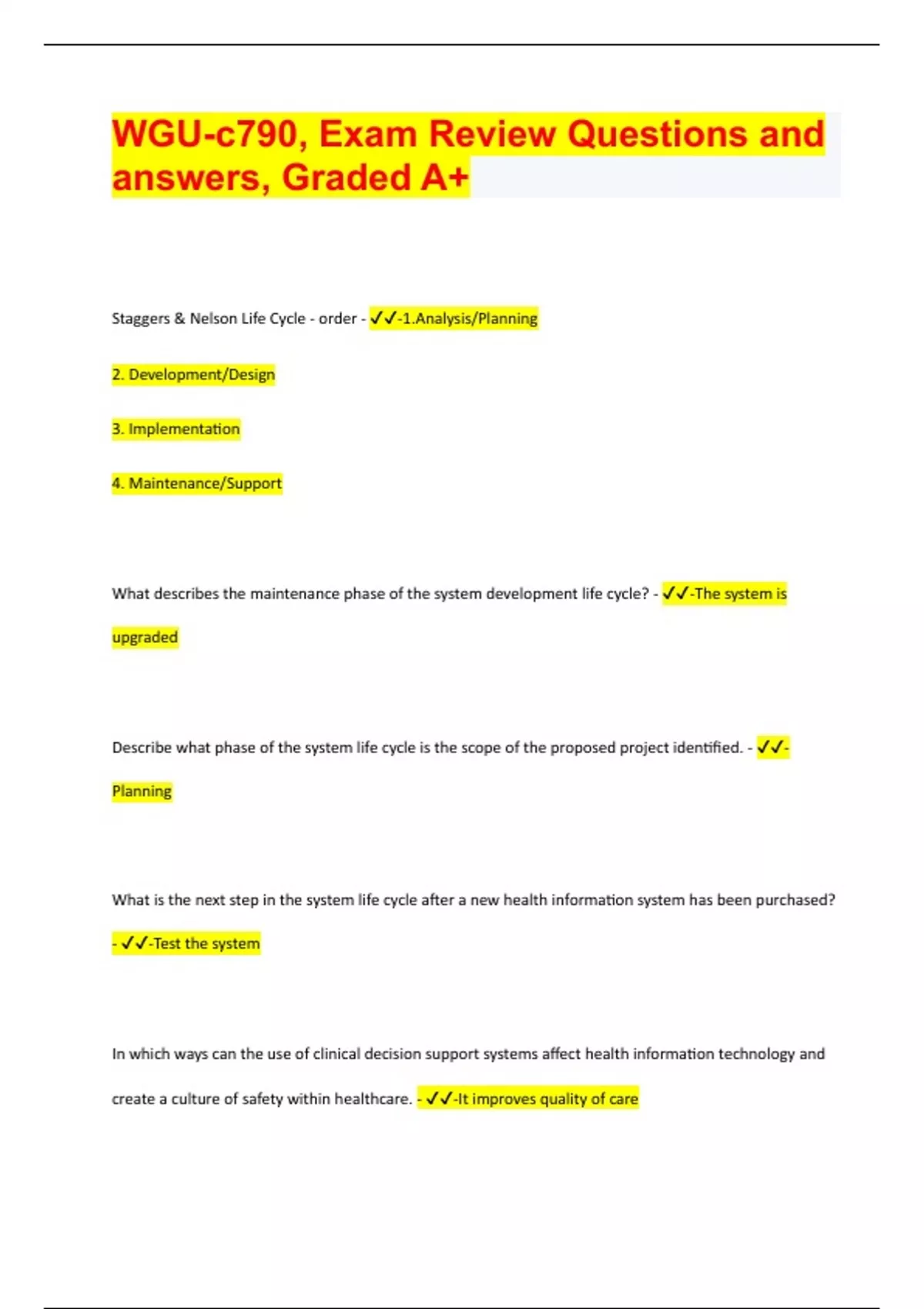 Staggers & Nelson Life Cycle - order - -1.Analysis/Planning 2. Development/Design 3. Implementation 4. Maintenance/Support What describes the maintenance phase of the system development life cycle? - -The system is upgraded Describe what phase of the system life cycle is the scope of the proposed project identified. - - Planning What is the next step in the system life cycle after a new health information system has been purchased? - -Test the system In which ways can the use of clinical decision support systems affect health information technology and create a culture of safety within healthcare. - -It improves quality of care
