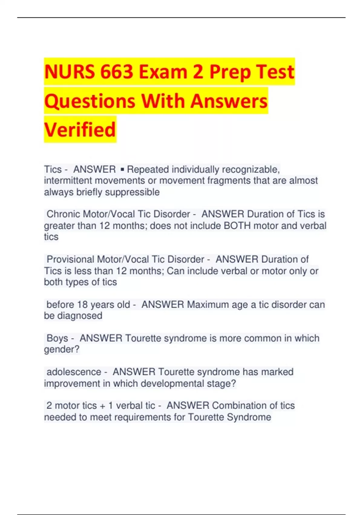 NURS 663 Exam 2 Prep Test Questions With Answers Verified Tics - ANSWER ◾Repeated individually recognizable, intermittent movements or movement fragments that are almost always briefly suppressible Chronic Motor/Vocal Tic Disorder - ANSWER Duration of Tics is greater than 12 months; does not include BOTH motor and verbal tics Provisional Motor/Vocal Tic Disorder - ANSWER Duration of Tics is less than 12 months; Can include verbal or motor only or both types of tics before 18 years old - ANSWER Maximum age a tic disorder can be diagnosed Boys - ANSWER Tourette syndrome is more common in which gender? adolescence - ANSWER Tourette syndrome has marked improvement in which developmental stage? 2 motor tics + 1 verbal tic - ANSWER Combination of tics needed to meet requirements for Tourette Syndrome Comprehensive Behavioral Intervention for Tics (CBIT) and Habit Reversal Training (HRT) - ANSWER Non-pharmacological treatment for Tic Disorders Alpha agonists (Guanfacine and Clonidine); anti- convulsants like Topiramate sometimes used as well - ANSWER First-line pharmacological treatment for Tic Disorders atypical antipsychotics - ANSWER Second-line pharmacological treatment for Tic Disorders Stereotypic Movement Disorder - ANSWER Repetitive, seemingly driven (voluntary), and apparently purposeless motor behavior (i.e. hand shaking or waving, body rocking, head banging, self-biting, hitting own body) Developmental Coordination Disorder - ANSWER a. The acquisition and execution of coordinated motor skills is substantially below that expected given the individual's chronological age and opportunity for skill learning and use b. S/S: Clumsiness (bumping into objects), Slow and inaccurate motor skills (catching, using scissors, handwriting, bike riding, sports etc)